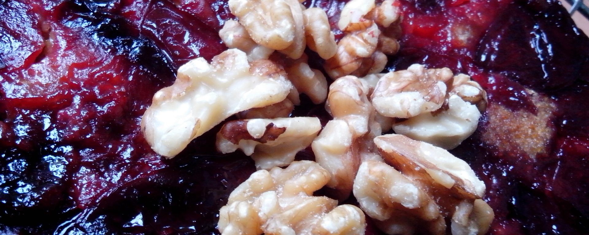 - place pieces of walnut in the spaces between the plum slices and 4-5 walnut halves around the centre