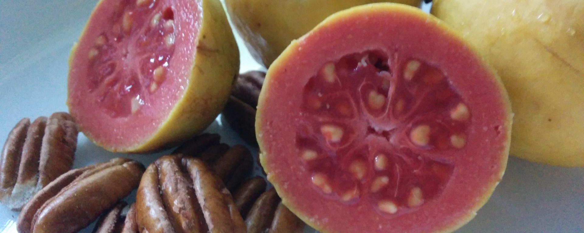Pecans and guavas are in season in Sydney and we are blessed with a bumper crop of each this year. This cake combines these two fruits into a dense nutty torte with a crumble topping, perfect with a good dollop of double cream and cup of coffee or tea.