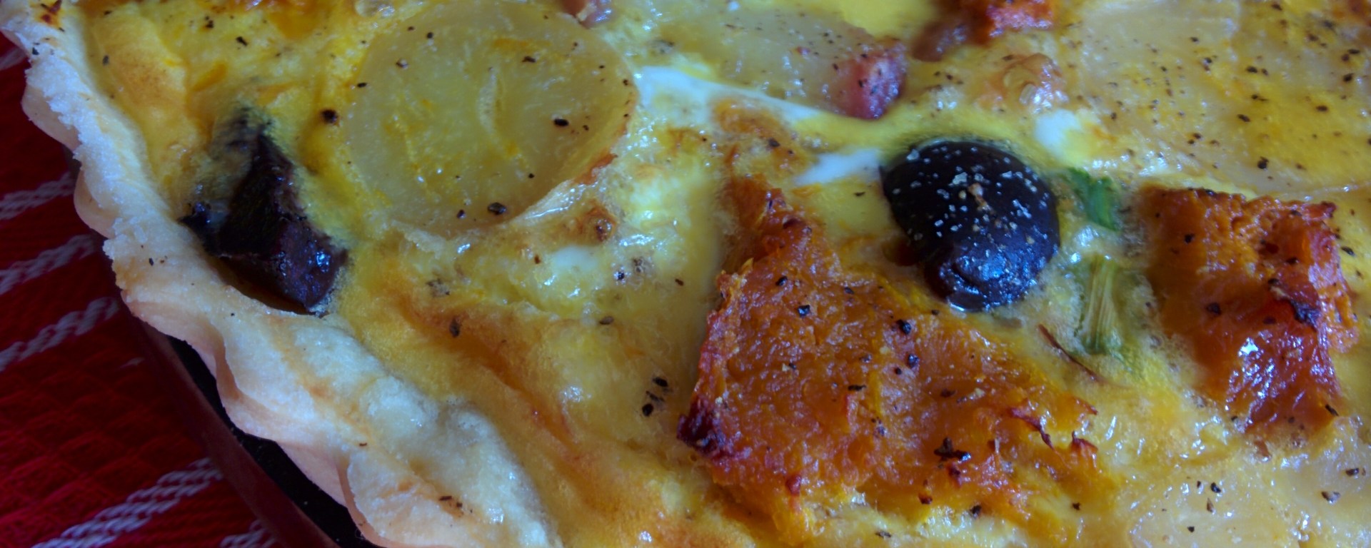 We have used the beautiful autumn colours of pumpkin, purple sweet potato, Kipfler potato, cheese and olives, fresh herbs and free range organic eggs make a tasty quiche, just right for lunch.