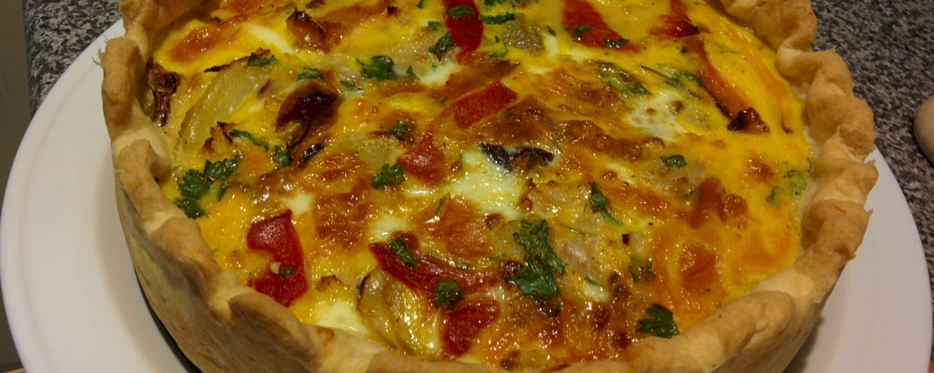 This pie is a variation on the classic egg and bacon pie with the addition of oven roasted vegetables – potatoes, two kinds of cabbage, leeks, caramelised onions, bacon and roasted capsicum. Half of the baked vegetables will make this delicious pie and the rest of the vegetables can be eaten alongside the pie or later, for a tasty accompaniment for meat.