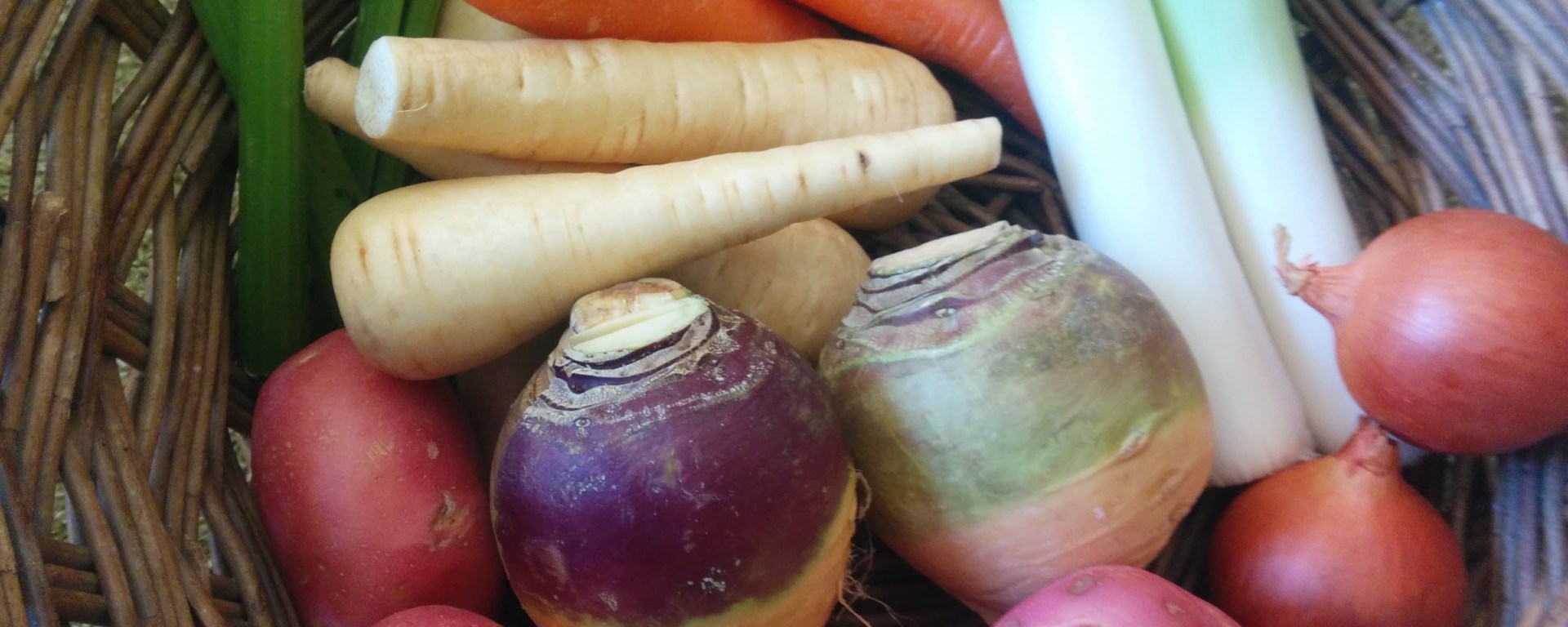Here is a way to use any root vegetables that you have to make a delicious and warming winter soup. Roasting the vegetables and caramelising the onions heightens the flavour of this soup. Serve with root vegetable chips made from the recipe included.