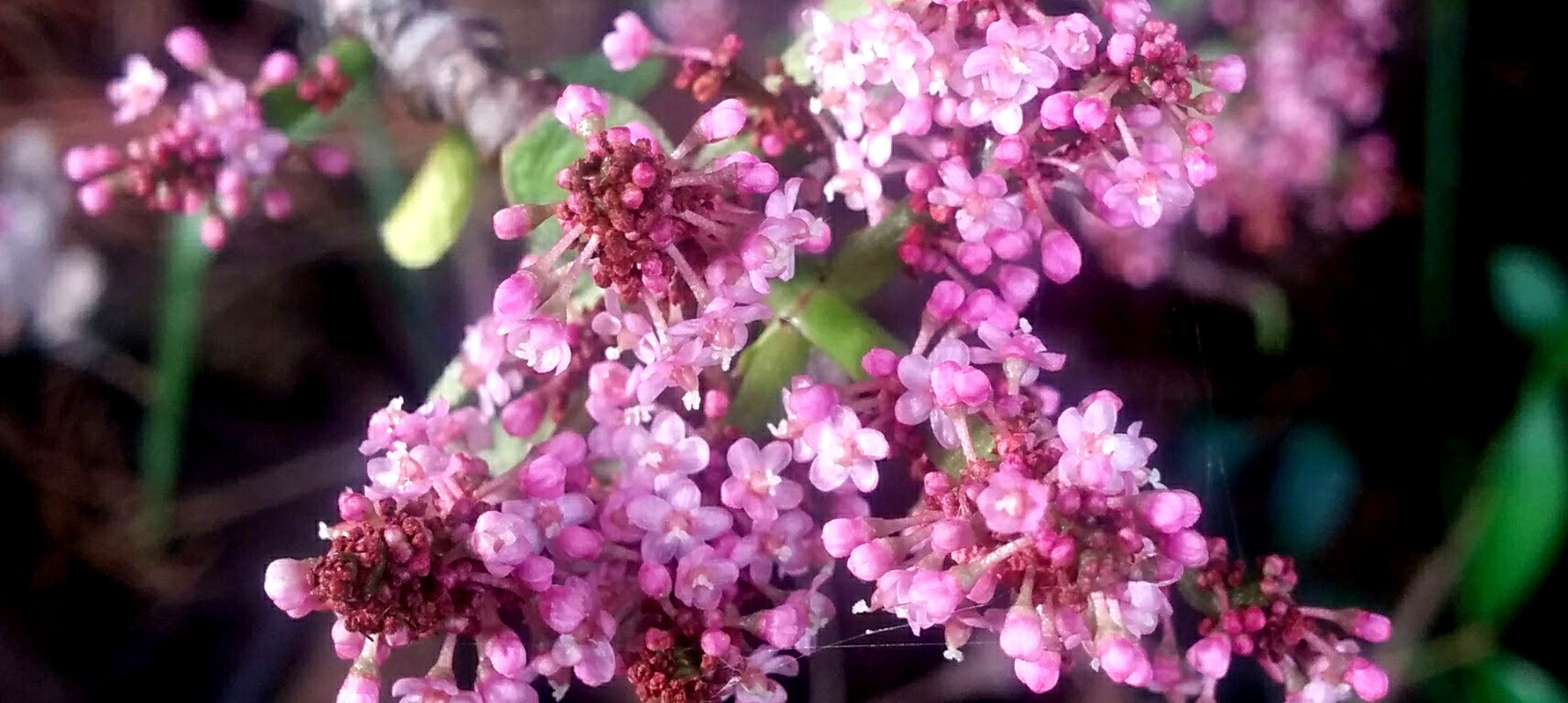 The delicate little bunches of blooms of five petalled pink flowers.