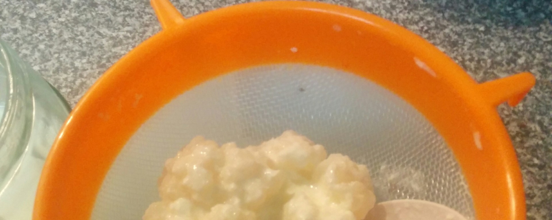- place the grain in the seive and shake it carefully to remove excess cheese from the grain and place the grain in a clean jar adding enough milk for the weight of the grain.