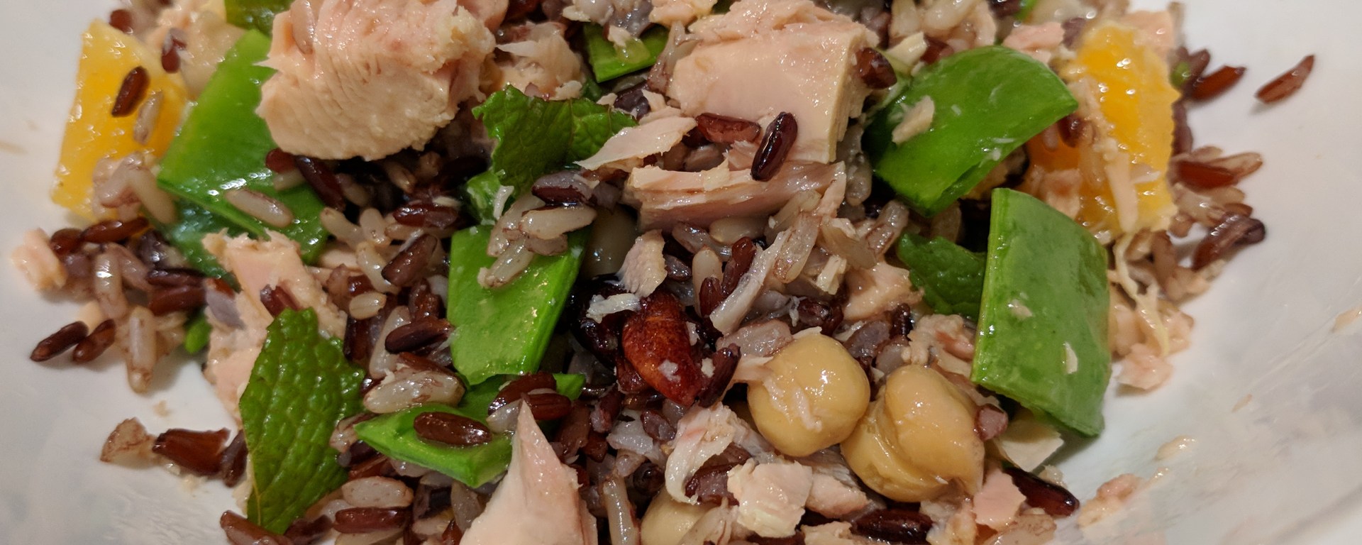 A healthy salad of seasonal vegetables, wild rice, chickpeas, flaxseeds and tuna makes a hearty and filling lunch.