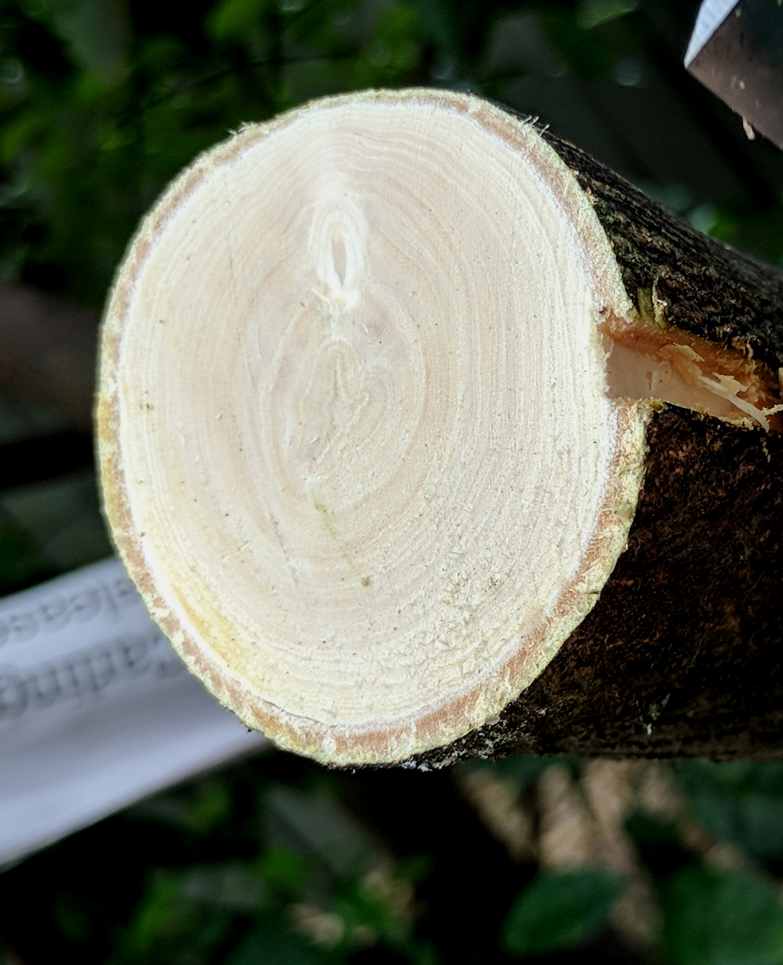 Choose branch to graft onto at around 100 -120 cm from the ground. It should be about 45 – 50 mm in diameter. Make a clean, smooth cut at a right angle to the branch that you have selected.