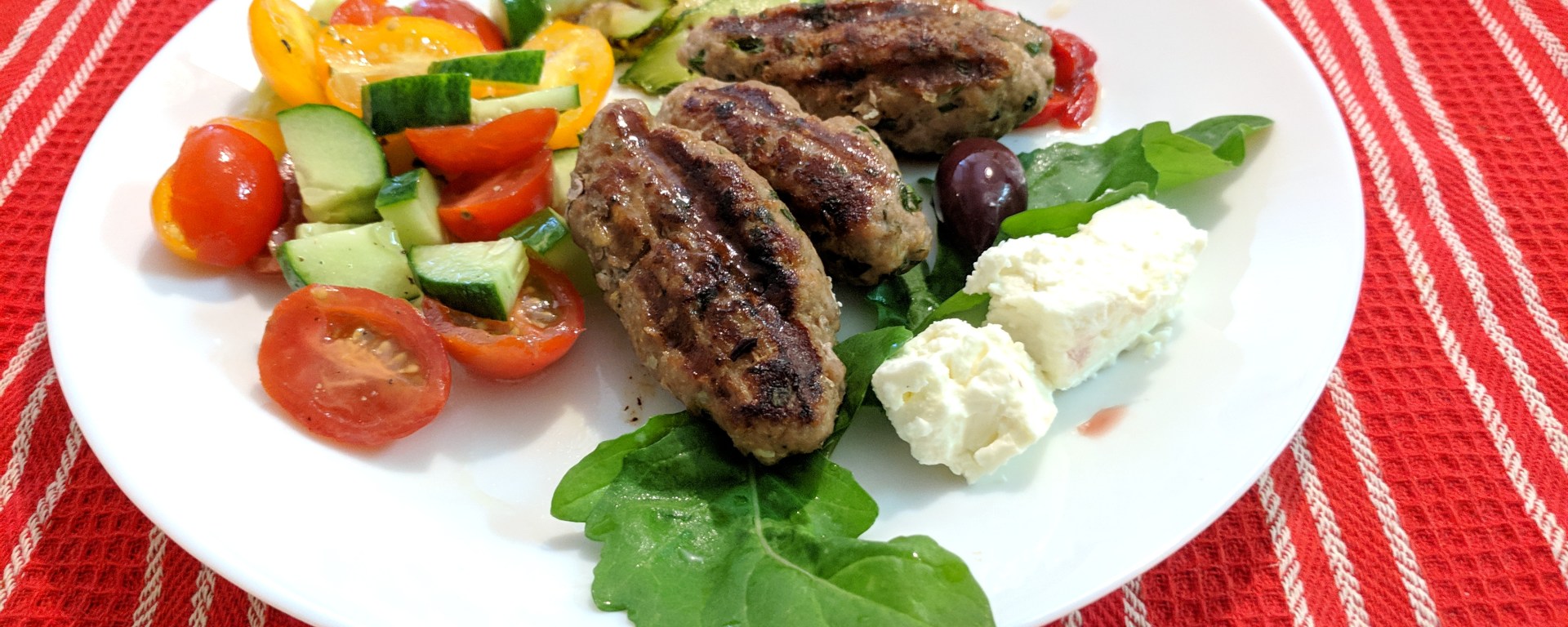 Today I will set out a quick and easy to prepare, tasty and delicious Mediterranean style lunch of Koftas with grilled zucchini salad. It is accompanied with a salad of mixed baby heirloom plum tomatoes and cucumber, roasted banana chillies, kalamata olives, feta cheese and Baba Ganoush dip. This is traditionally served with fresh rocket leaves, pita bread and wedges of lemon.