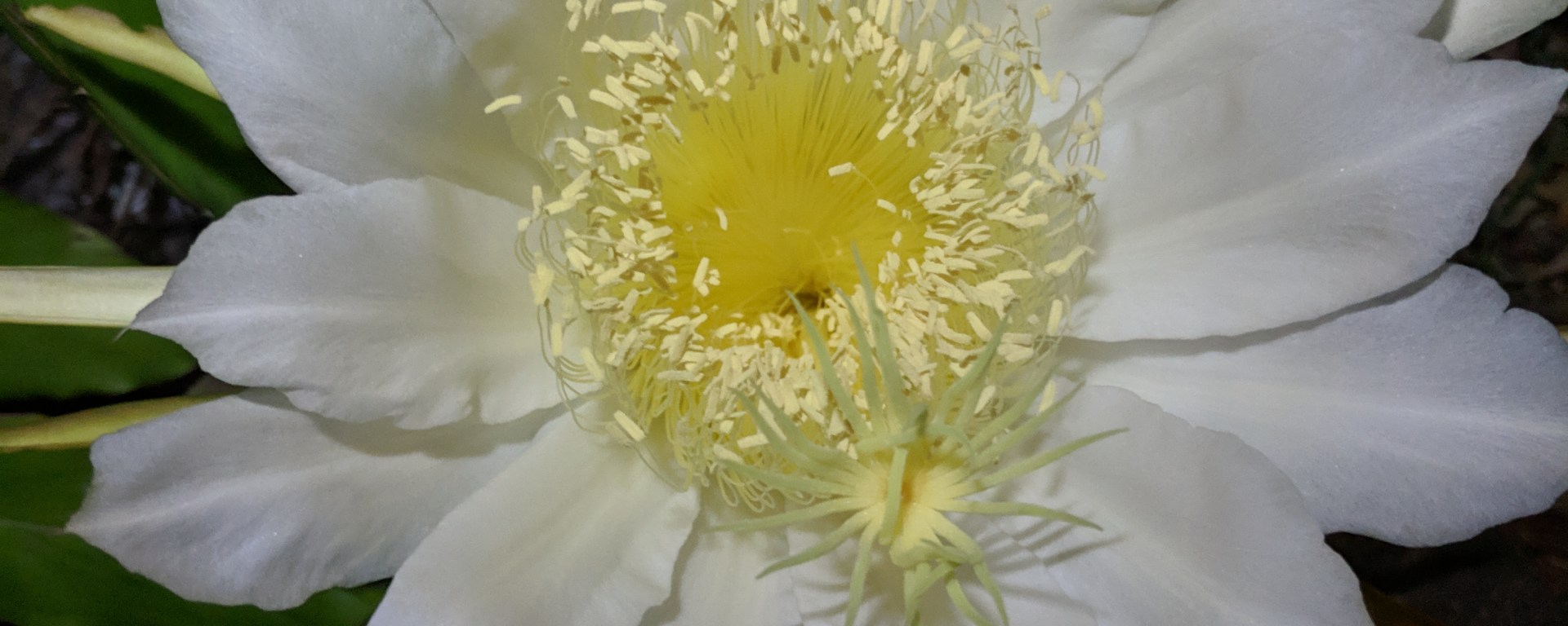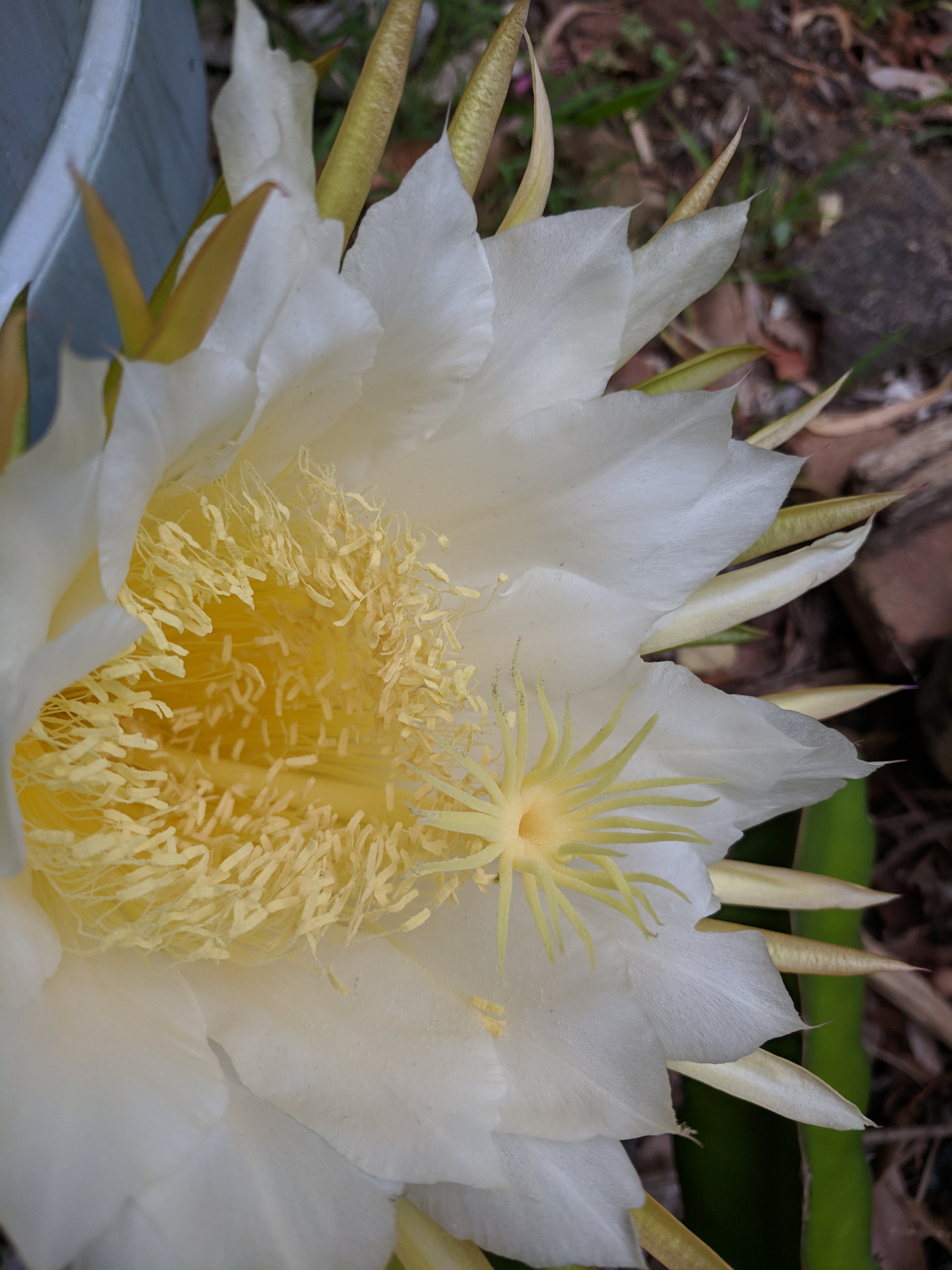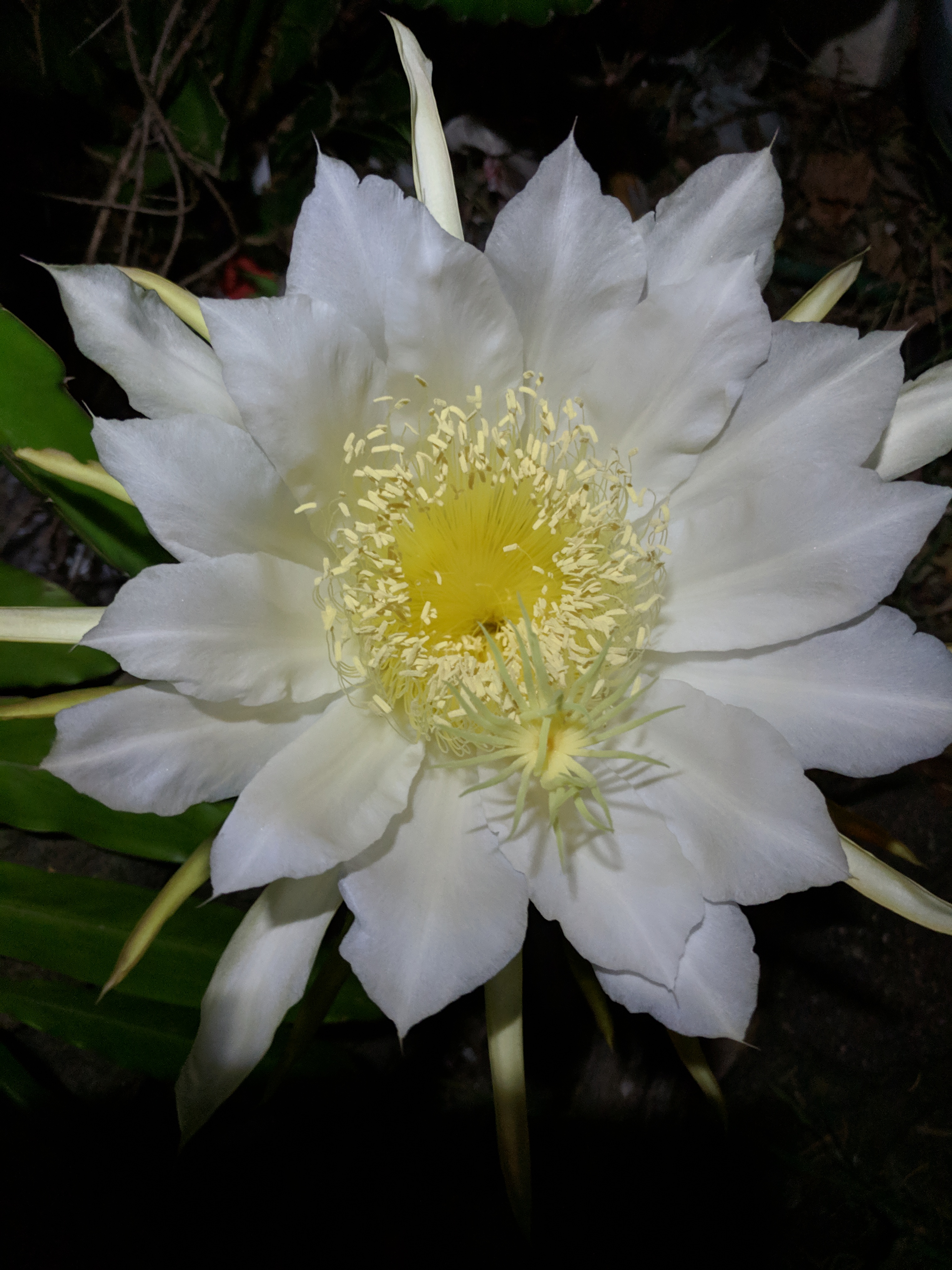 Recently, I had the pleasure of observing the night flowering Hylocereus undatus as it bloomed. This is the flower of the pitahaya or white fleshed dragon fruit.