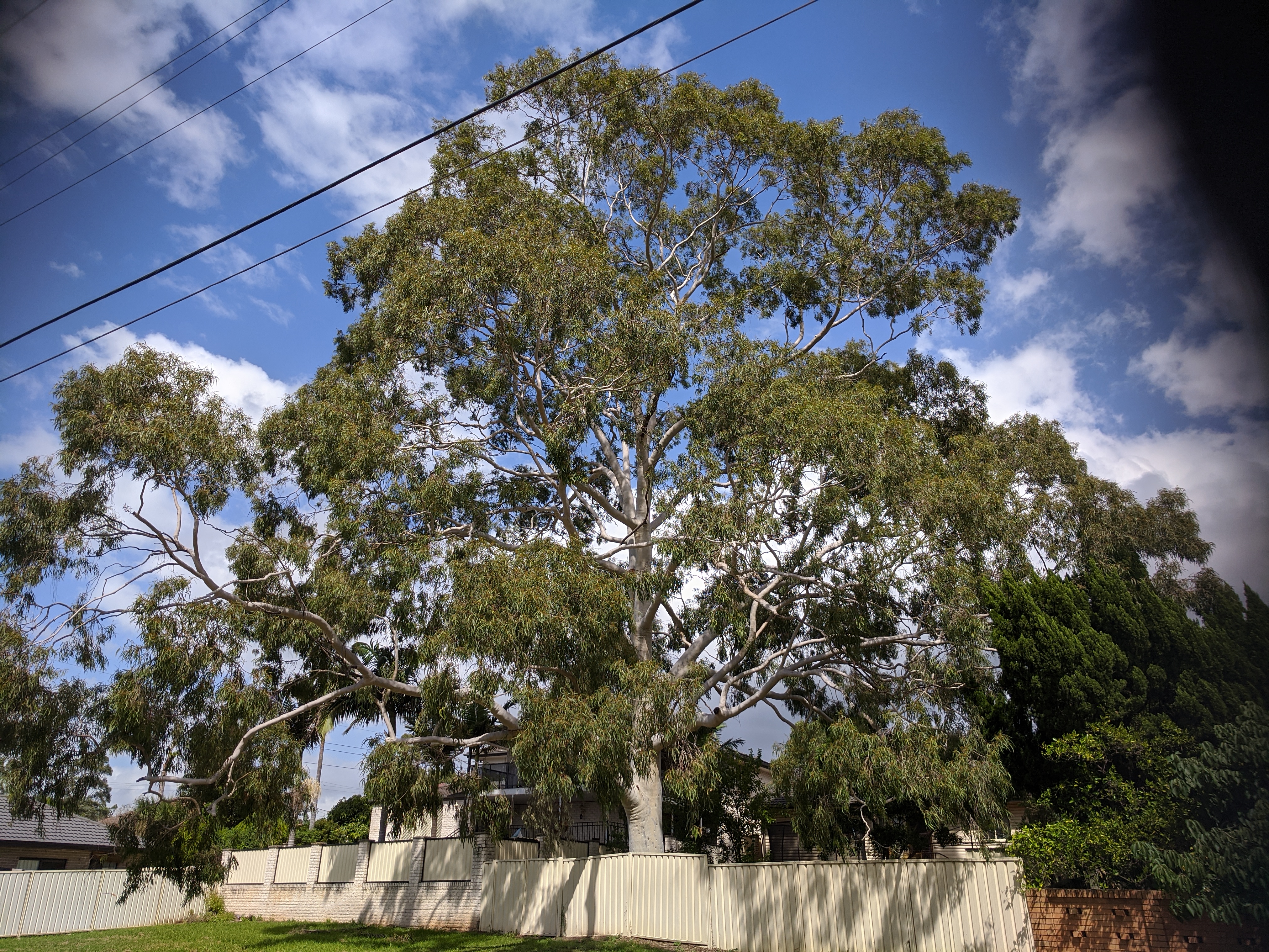 This Eucalypt has been an imposing tree in the neighbourhood, a mixture of grand beauty and habitat for so many species for over half a century. Its leafy branches bring cooling shade during the mid 40 degree scorching summers days of Sydney, and it stands stark white in dark storms, hinting at danger as everyone looks out to see if branches have fallen.