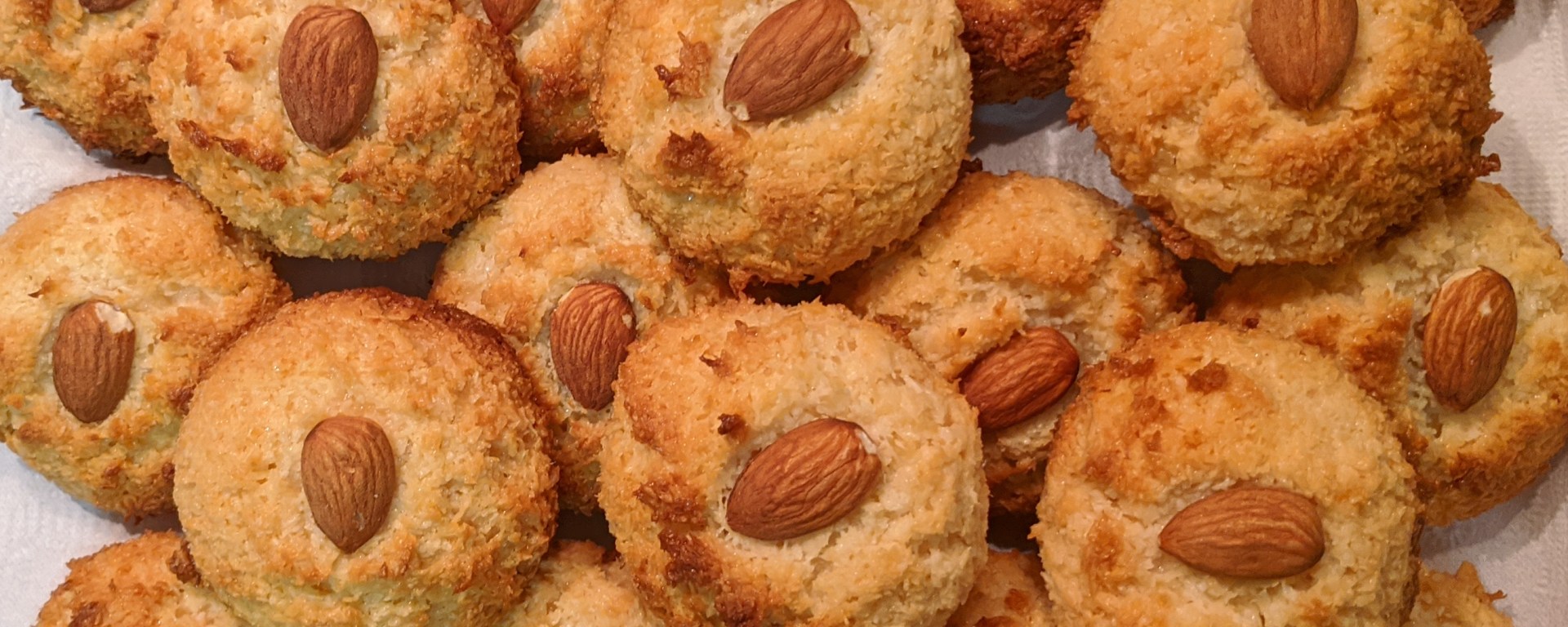 These pretty macaroons are the easiest biscuits to make. Just stir the first two ingredients together and decorate with an almond and bake. So easy and delicious and just right to have with a nice cup of tea or coffee.