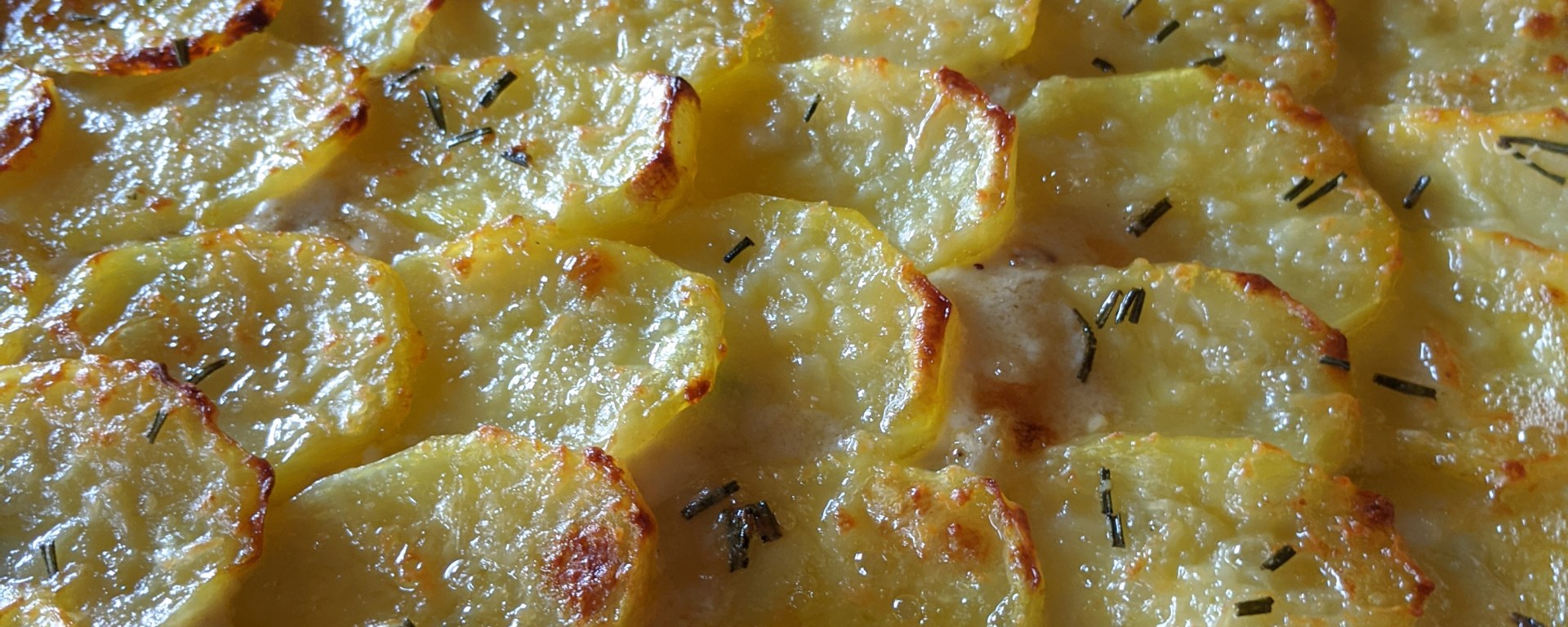 Italian sausages cooked in wine with rosemary and a cheesy bechamel enriched with leek, sweet red onion and herbs form the base for the scalloped potatoes.