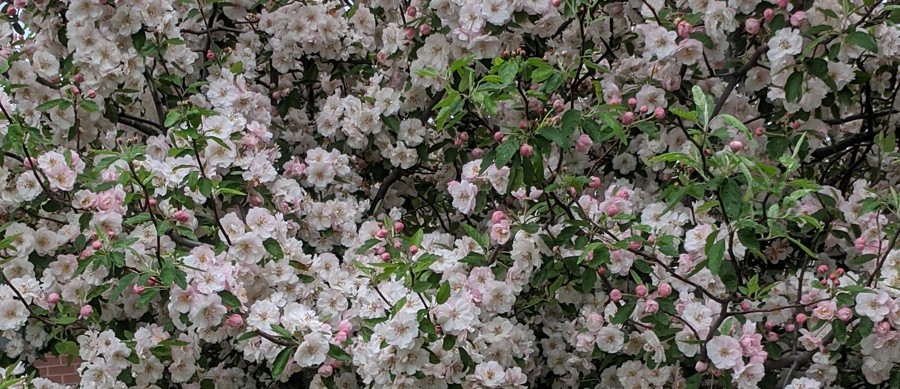 Here is the full grown Malus ioensis ‘plena’ in glorious bloom. As you approach you become aware of the heavenly scent and the buzzing of happy bees. Click on the picture to get a closer look: