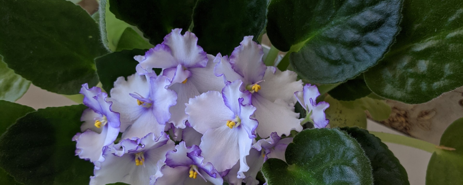 The stunning African violet, ‘Optimaro chico’ has petals that have a frill and are lightly edged in purple.
