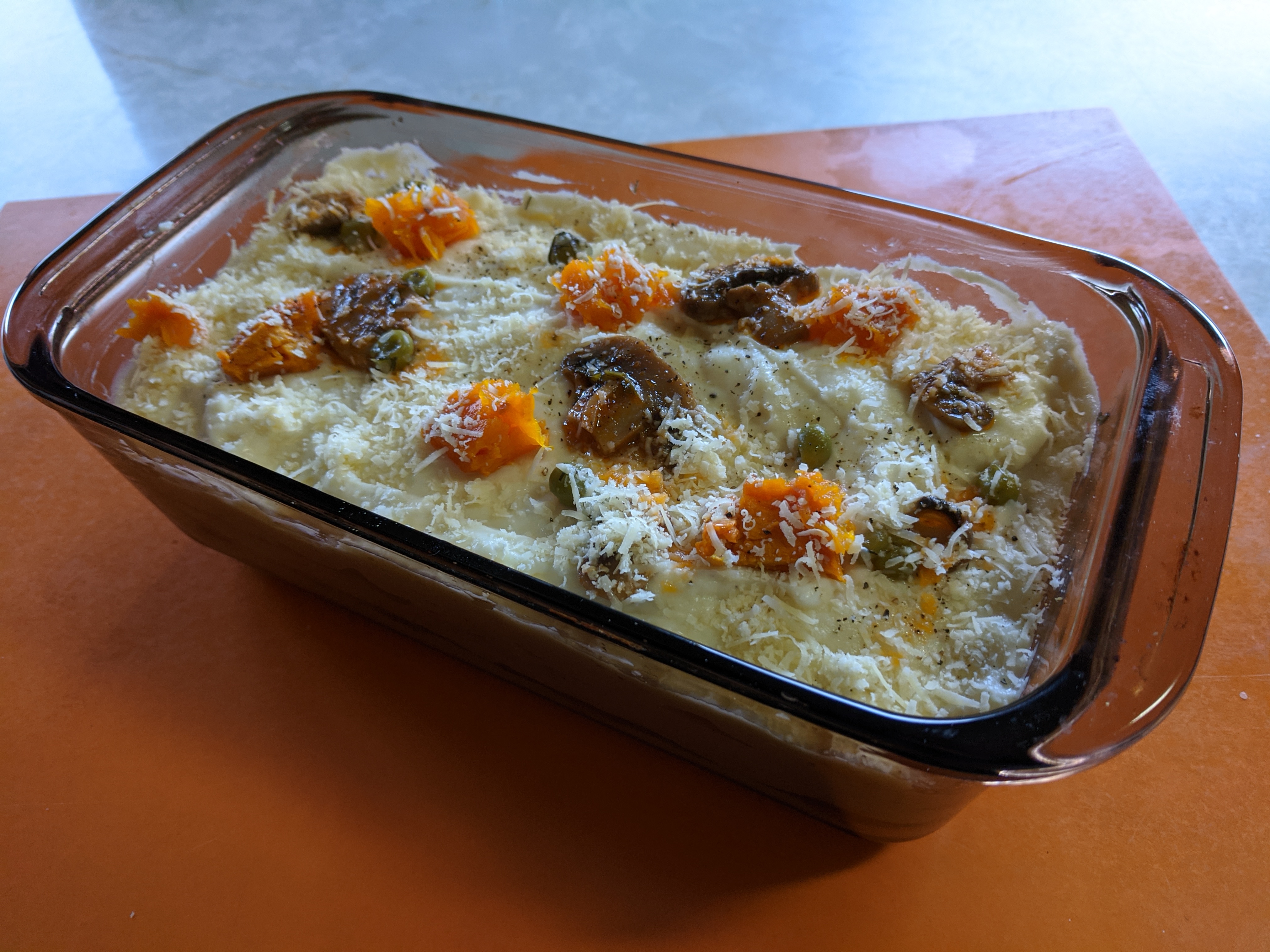 11. Scatter a few scant pieces of pumpkin, peas and mushroom over the top. Then sprinkle more grated Parmesan cheese over the top and a little ground black pepper