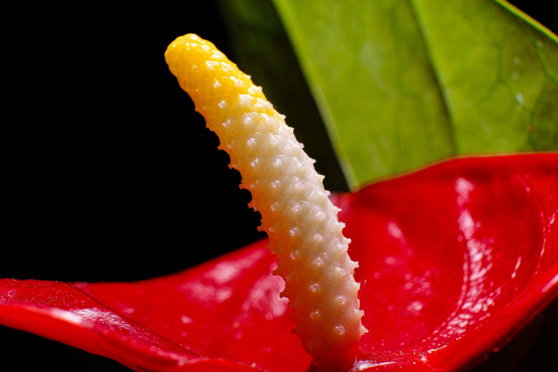 Below the spadix is the heart shaped spathe, a form of bract that is waxy and brightly coloured, in this case red. The spathe can be a number of colours from white, pink to highly coloured red. Click on the image below to enlarge for detail.