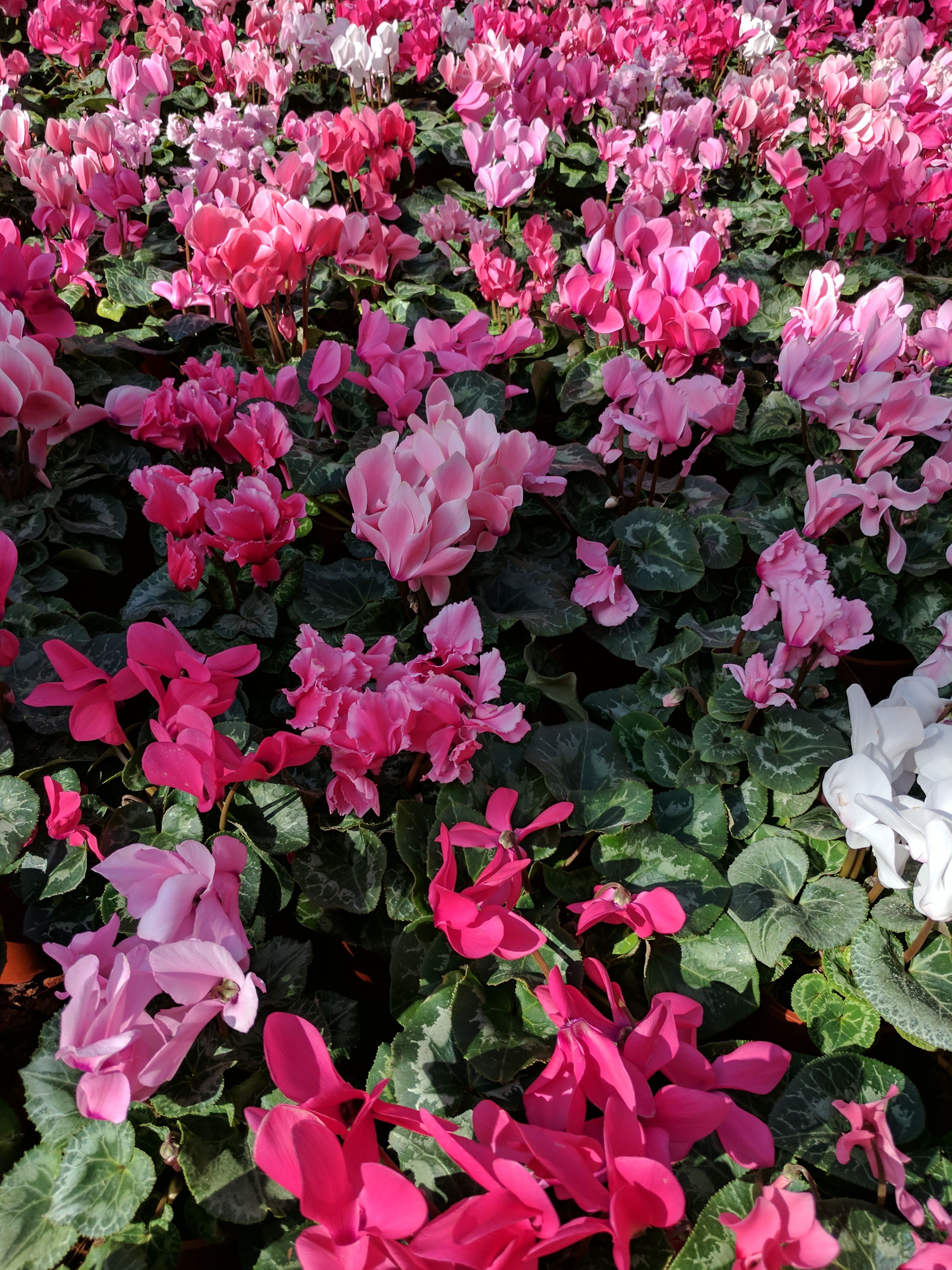 Cyclamen come in a variety of colours and can be white, pale rose, pale to deep pink, carmine, purplish, red, and crimson