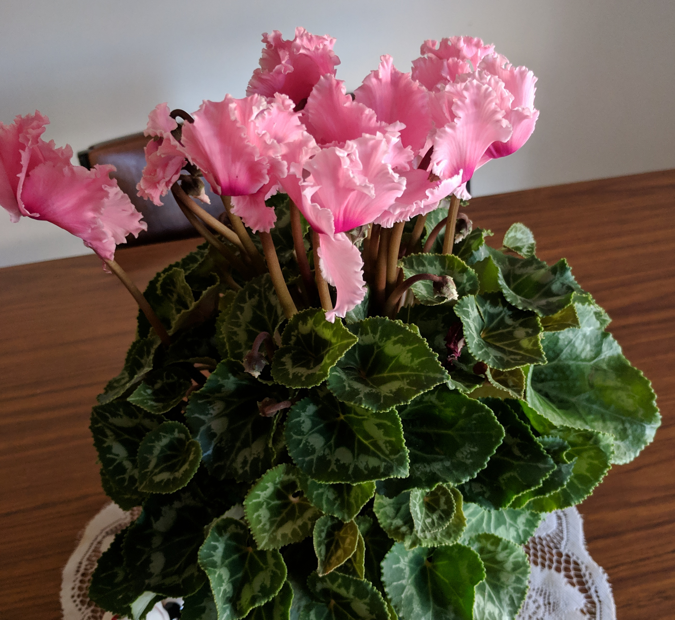 Florists’ cyclamen are cultivars derived from the wild Cyclamen persicum and sold all over the world. They flower during the winter in a range of colour shades from white through pink to red. The image below is of a lovely pink specimen with frilled petals.