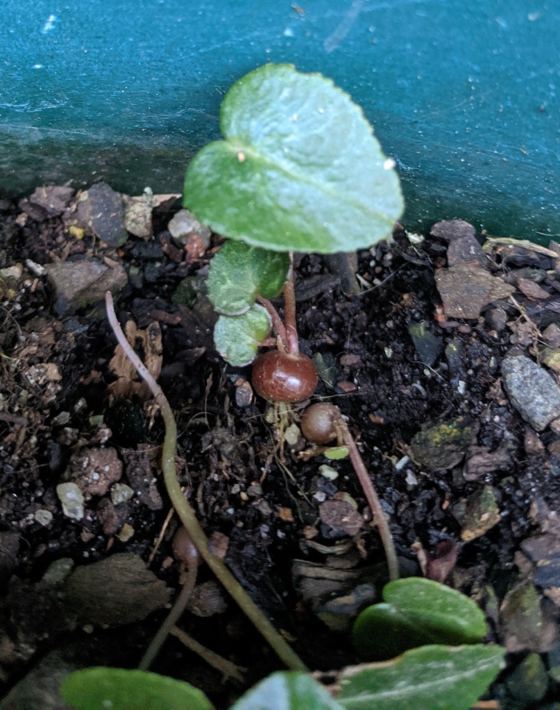 The pod is about 1.5cm and holds between 5-40 sticky seeds. Often ants are attracted by the sweet coating and disperse the seeds so that you find new little cyclamen plants far from the original location. The young plant below popped up in a garden bed that is close to a much used ant trail. It is about 2m from the parent plant. It takes about 2-3 years from seed to flowering.