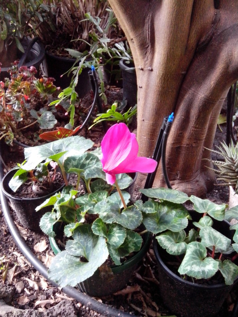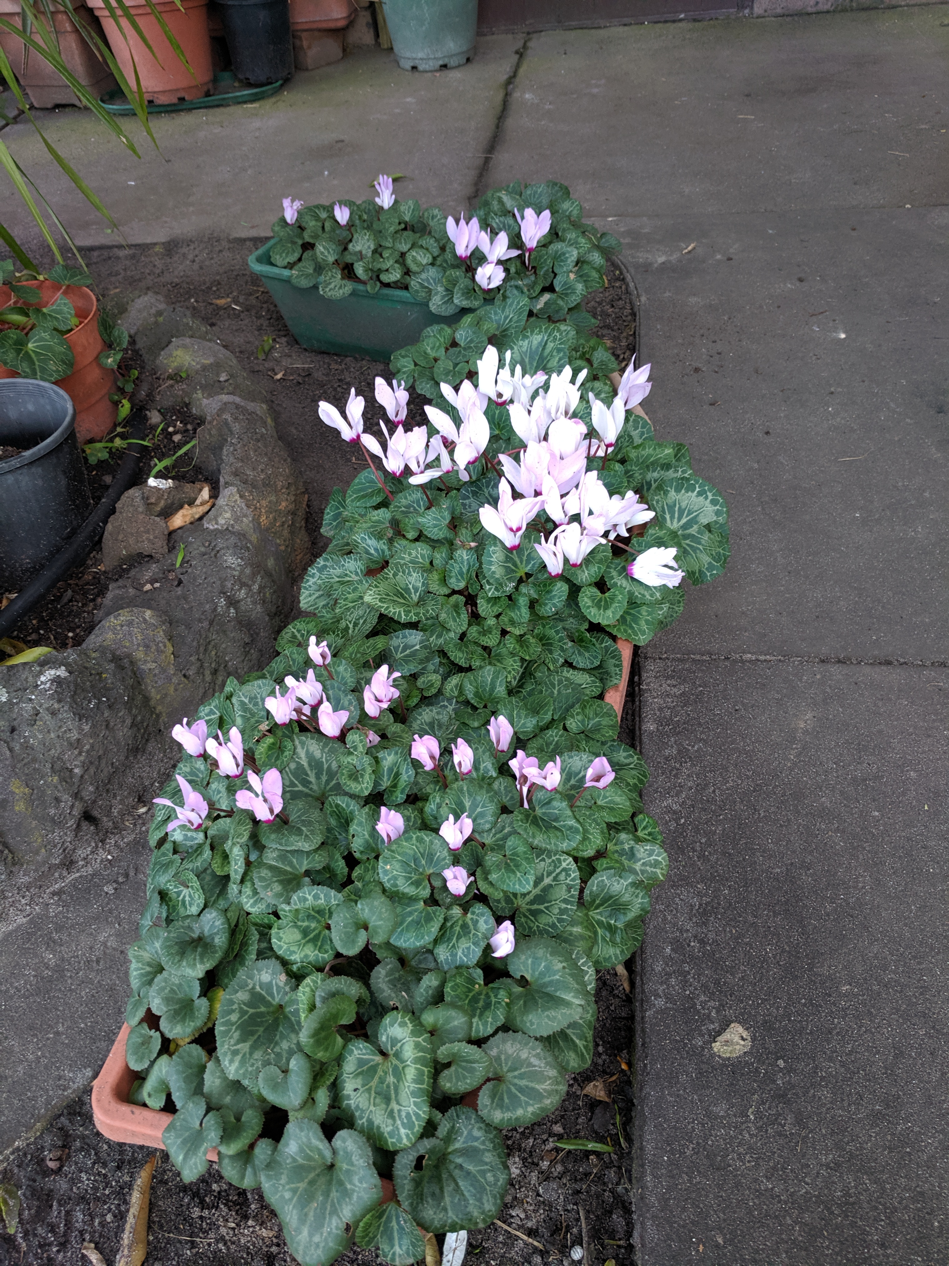 The image below shows pots of small Cyclamen persicum that have been growing in a protected corner of the garden under a large mandarin tree for many years.