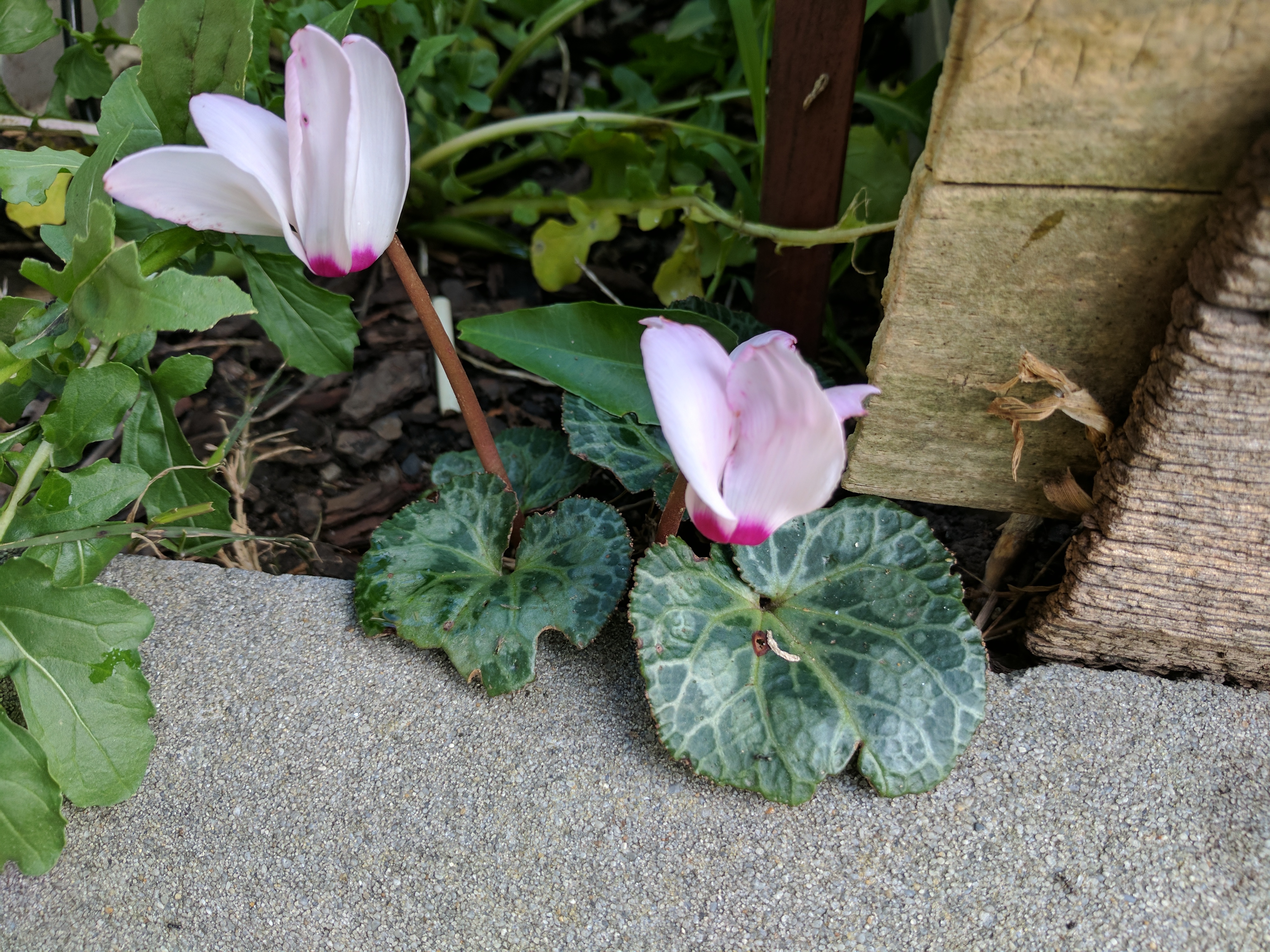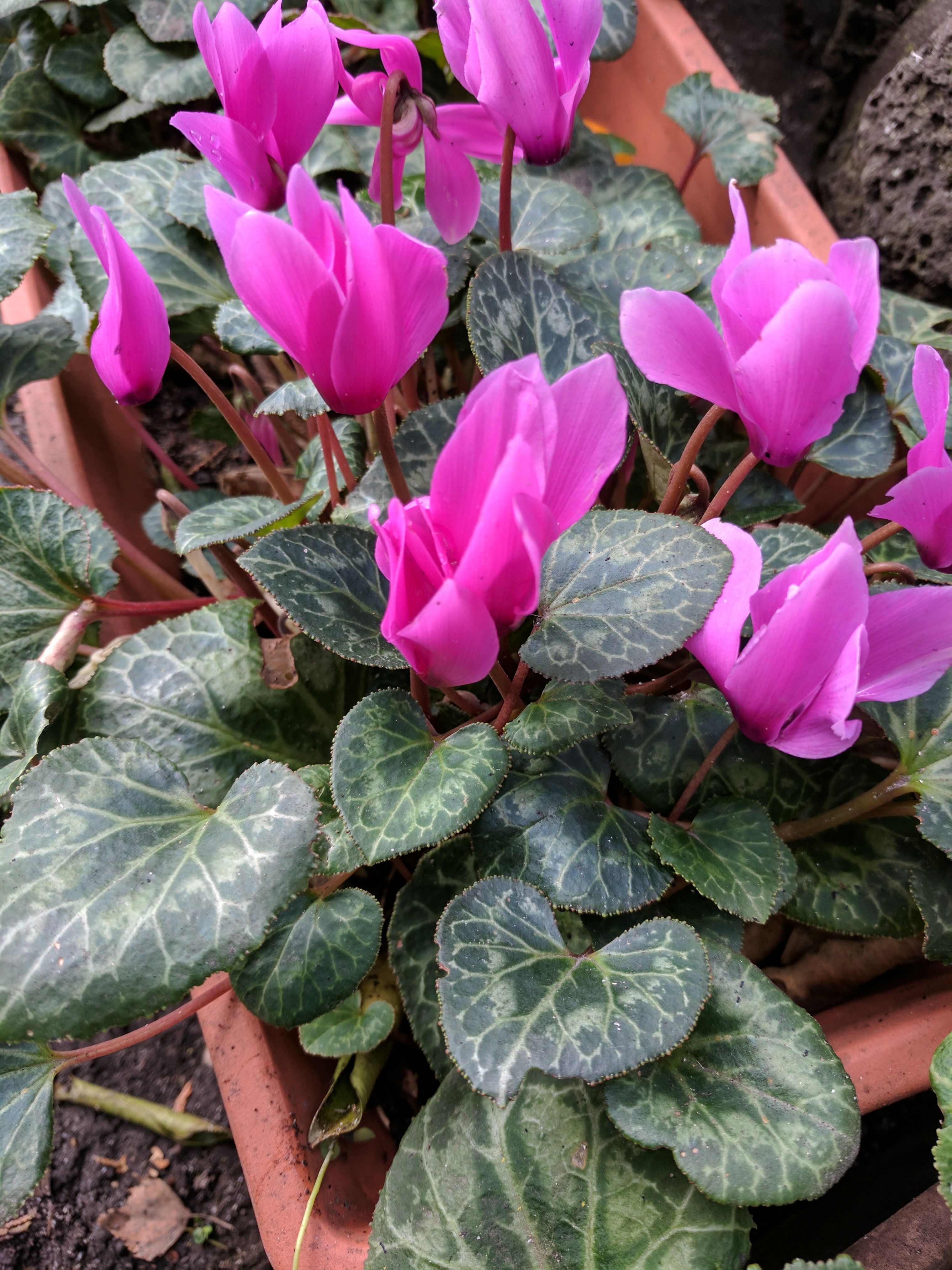 The Florists’ Cyclamen below have been growing successfully in a sheltered space outside a window. The location gets morning sun, available rain and is protected from draughts. This picture was taken last year and the plants have gone through dormancy and are now in full leaf just beginning the flowering period in temperate Melbourne.