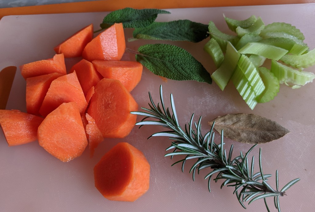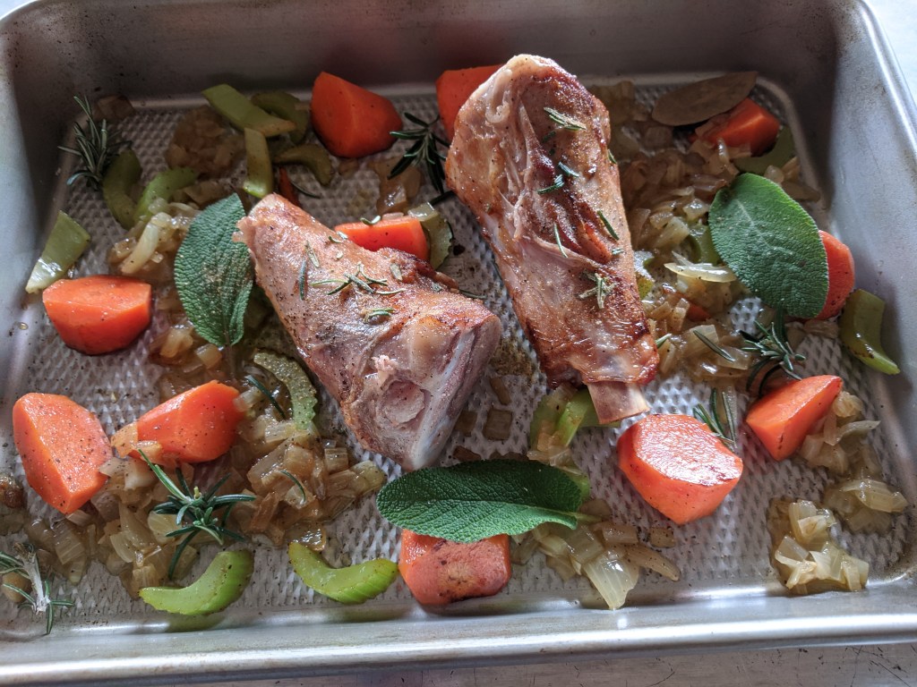 3. Into a 1L container, place the shanks, 1/4 onion sliced thickly, half a celery stalk top end sliced and half a carrot chopped roughly and scatter over shanks.