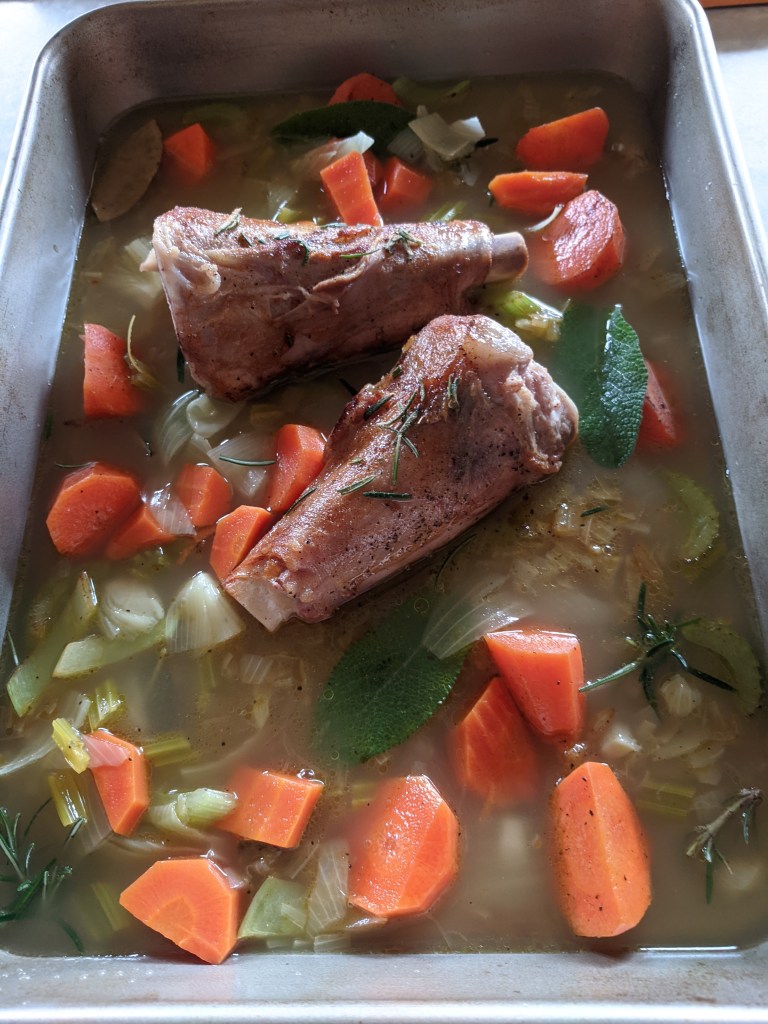 13. After an hour, carefully remove foil, turn the shanks and baste them with pan juices, cover tightly and return to oven. Repeat at 2 hours.