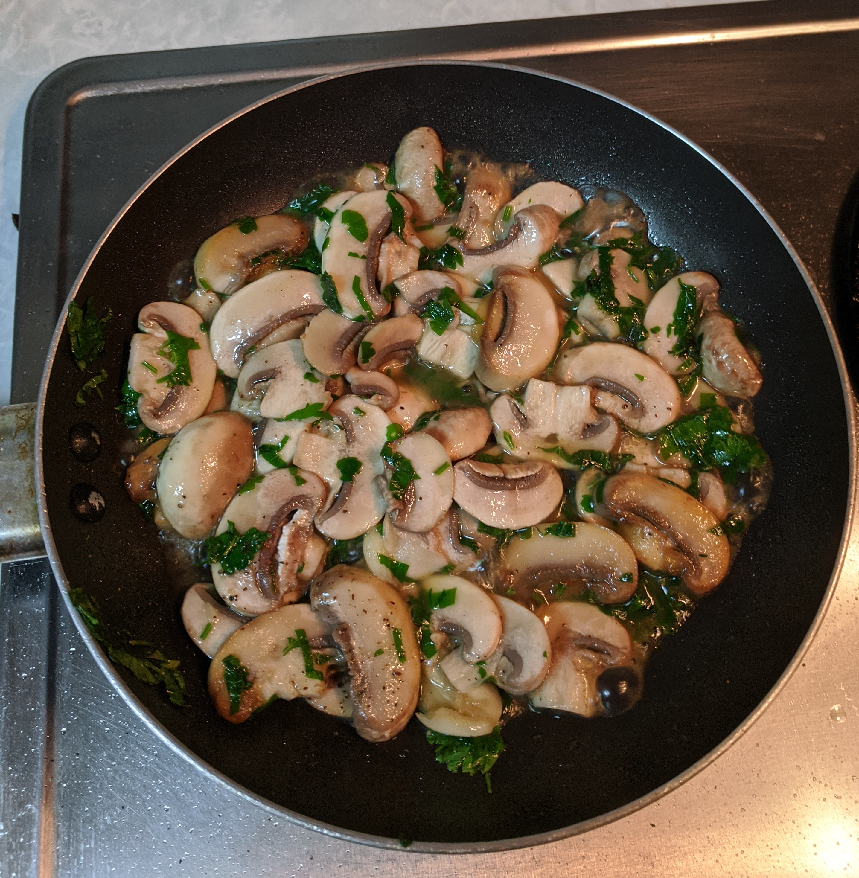 19. Dissolve the teaspoon of cornflour in 2 Tblsp of water in small glass, then add to the pan juices to thicken, simmering for a couple of minutes to the consistency that pleases you. Then, to keep the mushrooms fleshy, quickly cook them separately with the herbs as follows
