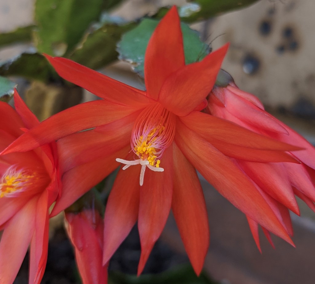 The flowers are a beautiful scarlet and star shaped in form and are 4-5 cm long. They emerge from notches at the base of the segments called areoles that are characteristic of cacti. When open, the flowers are a funnel shape that is a maximum of 4-7.5 cm. The structure of the flower differs from other Schlumbergera species, which have a short floral tube at the base of the flower formed by fused petals, and stamens arranged in two distinct series, whereas S. gaertneri has separate petals and a single series of stamens.