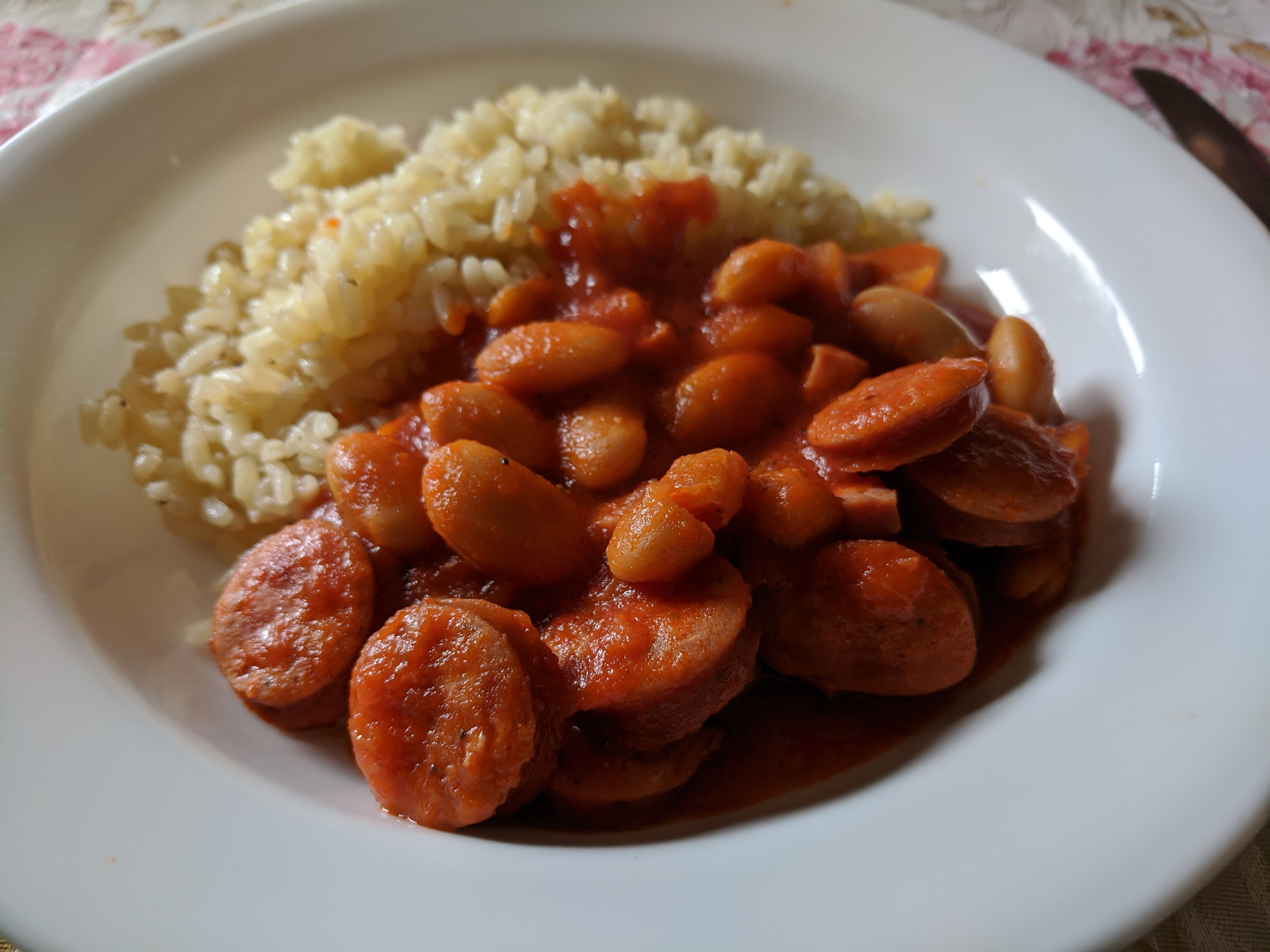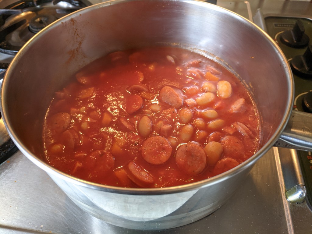 11. When the kabana, ham and beans has finished cooking, the liquid will be reduced and the sauce will be rich and thickened