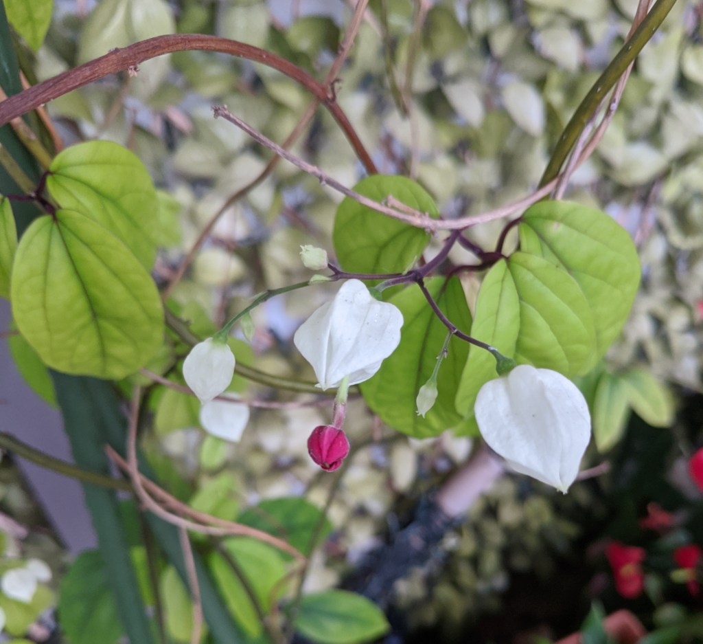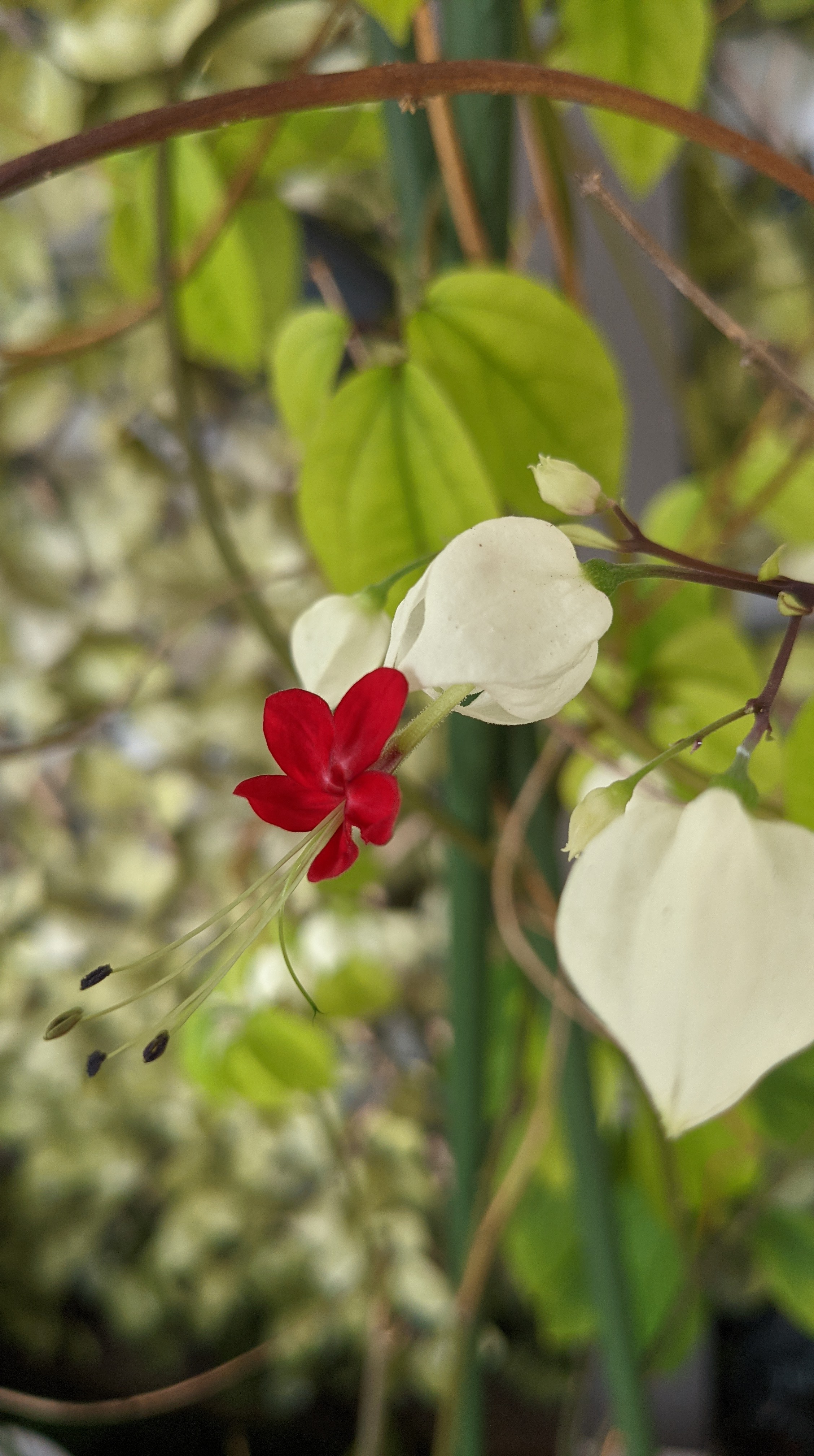 Clerodendrum thomsoniae, or the bleeding heart plant is a tropical evergreen twining liana or vine that is native to west Africa, in the mint family lamiaceae (not to be confused with the members of the genus Dicentra, also called Bleeding heart). Its common name comes from the deep red flower that comes out of the pure white, five lobed calyx like a drop of blood.