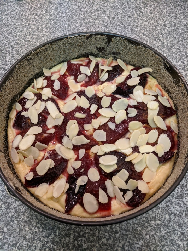 11. Working quickly, place the stewed plum segments over the top of the cake batter