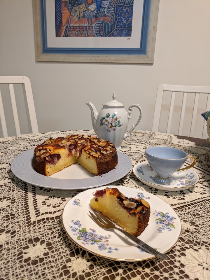 I particularly love spiced stewed plums. The season has ended for plums so I have indulged myself by stewing the last few from my fridge. The result is a compote of sweet plums in a thick, rich and spicy syrup that is so delicious and perfect for the topping for this cake.