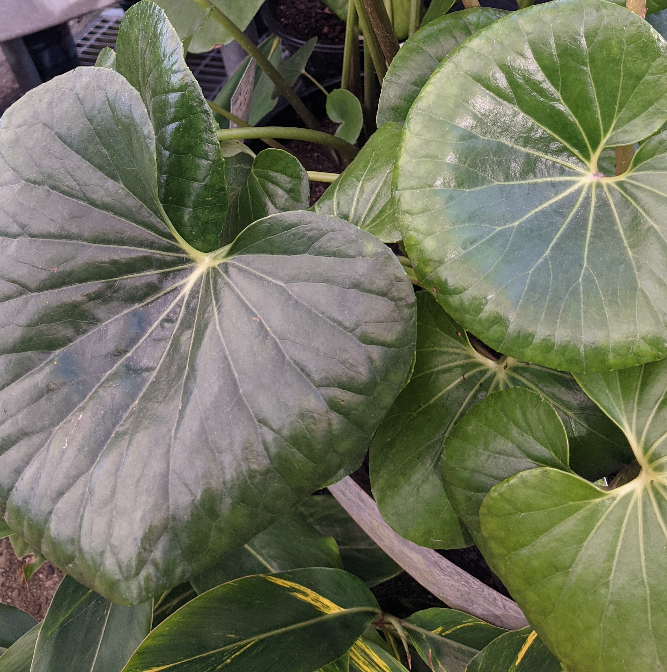 Each glossy, dark leaf grows up to 45 cm across and is adapted to the light conditions in which it grows, developing to a darker green and growing larger in shady conditions.