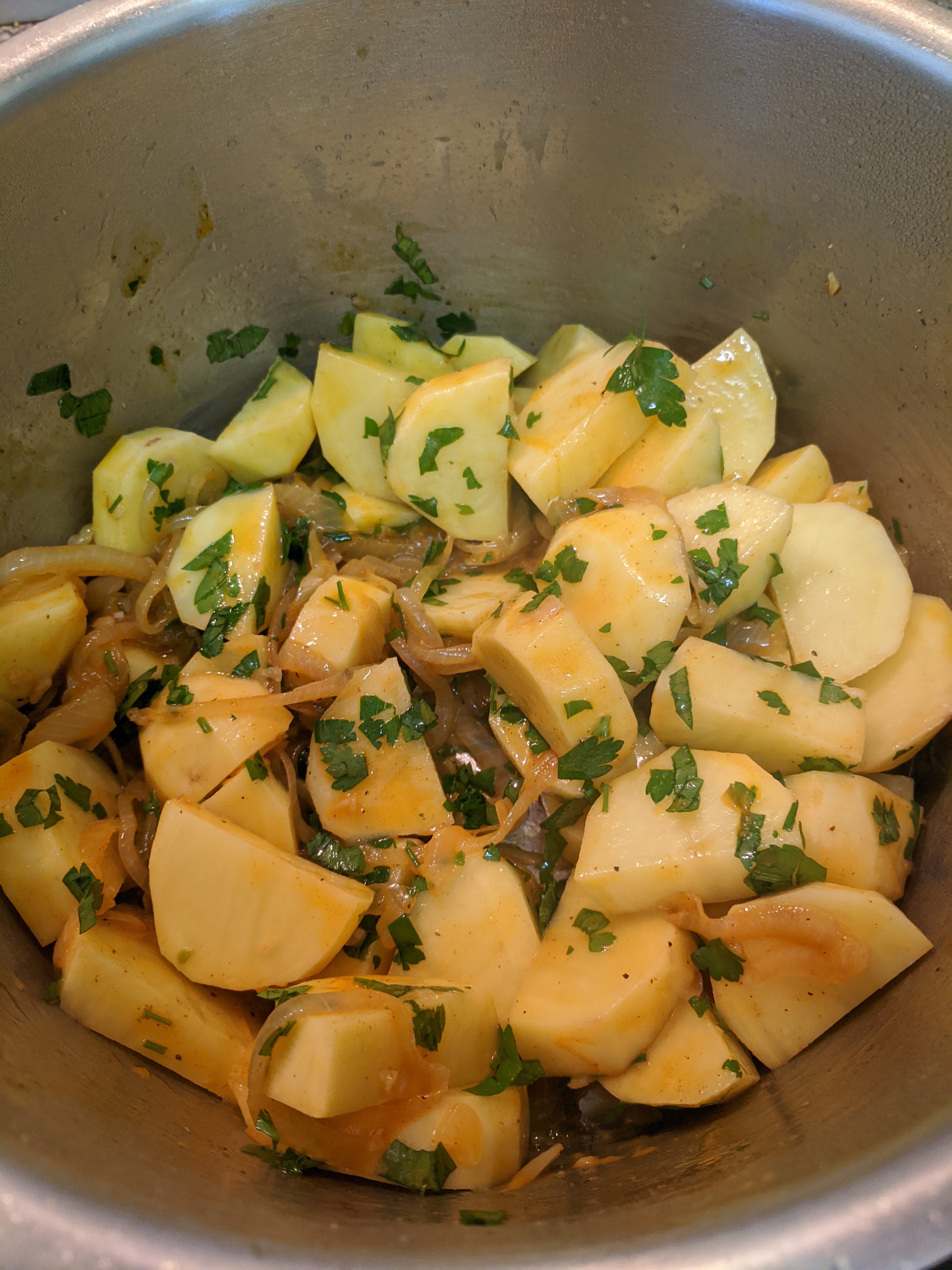 9.Then add the sliced potato pieces, chopped parsley, sage and stir to combine with the onion mixture