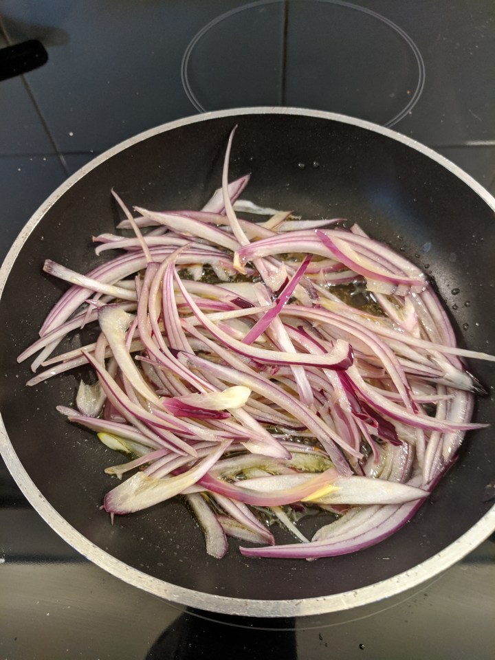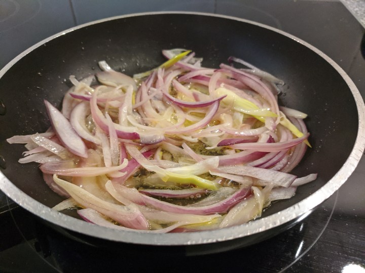 13. Place the red onion slices into the fry pan and slowly cook them for about 8 minutes till they become transparent and caramelize. Add a little water to the pan if they start to catch