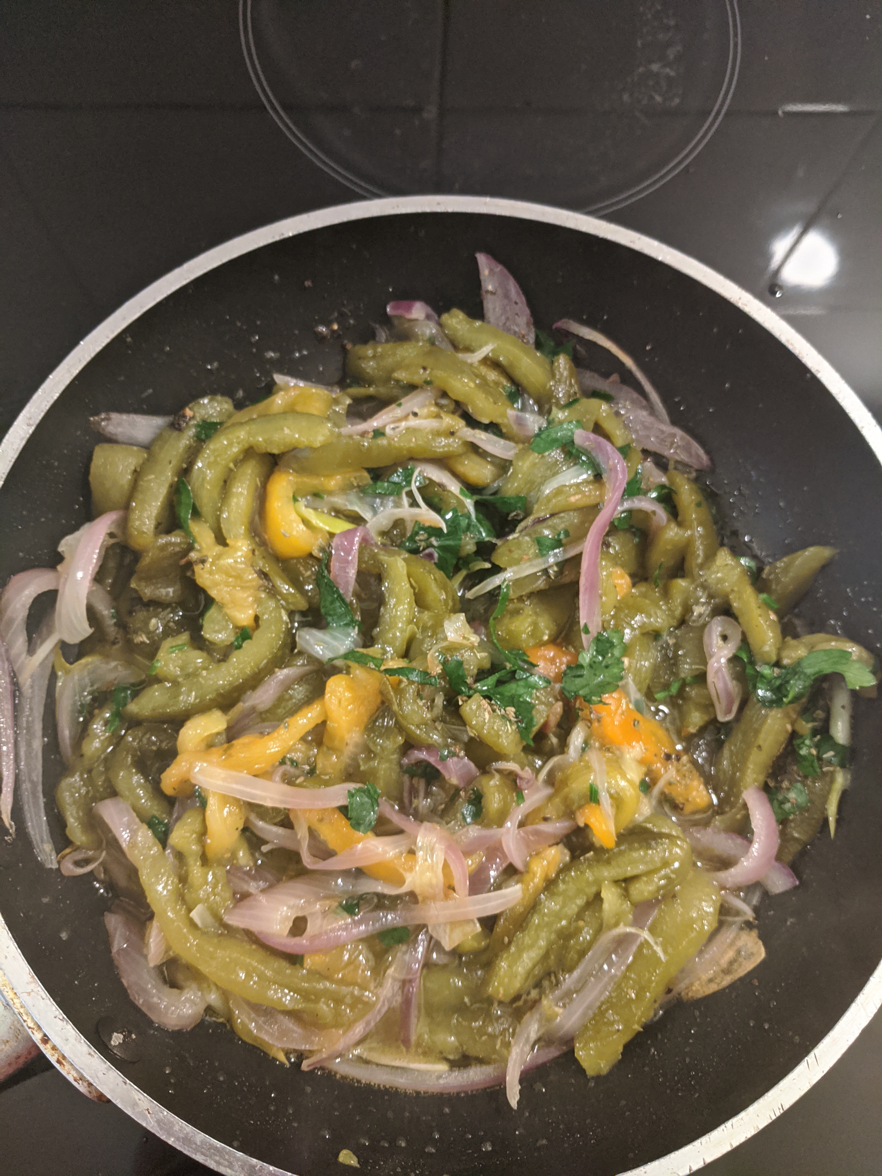 14 When the onions are well caramelized stir in the roasted capsicum strips