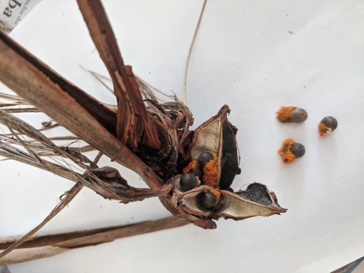 As the pods dry out they open outwards and release their seeds. They are brown to black with bright orange arils. These fall to the ground and will need another two months to germinate under good conditions.