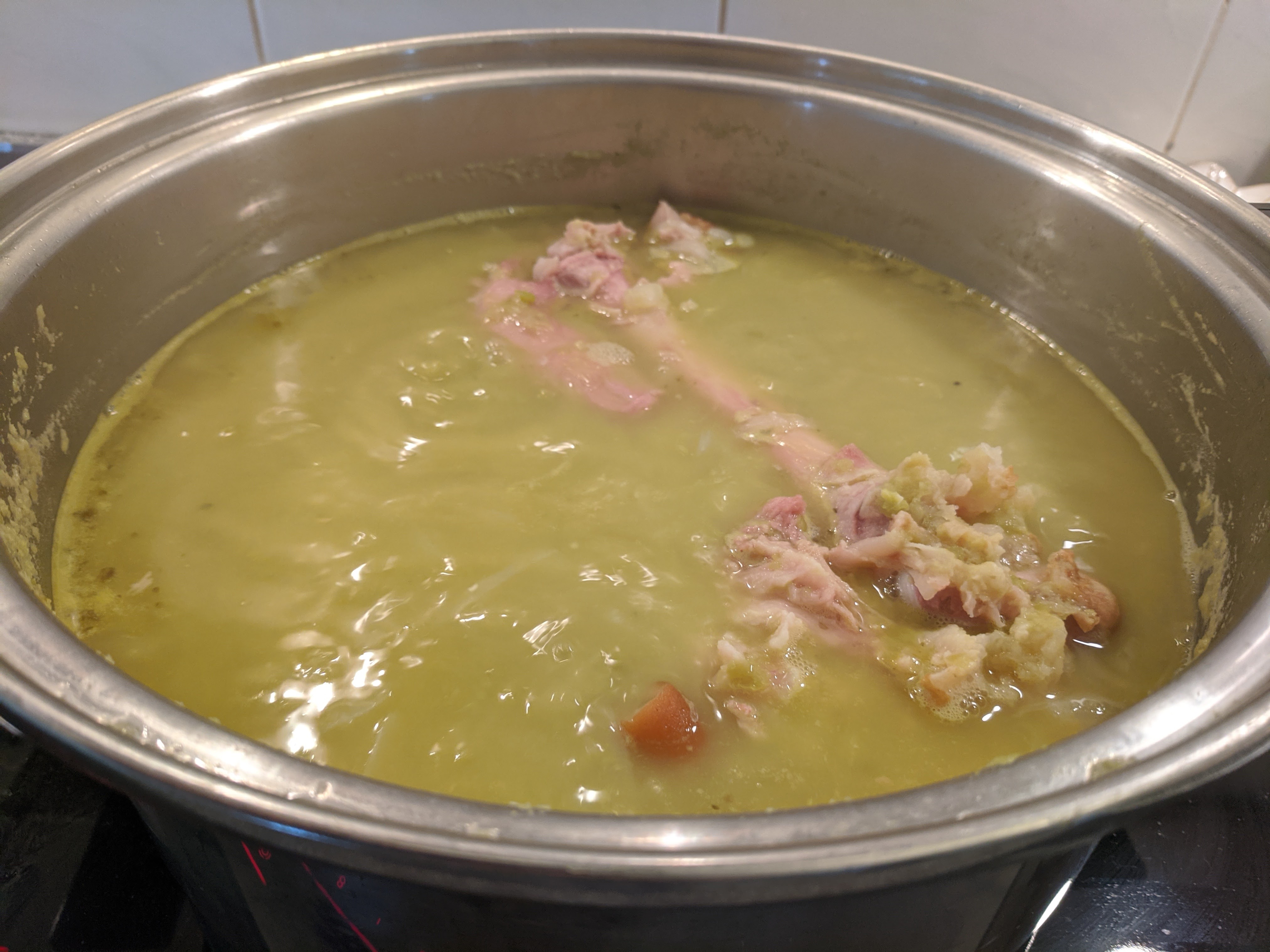 Lots of lovely ham pieces that just fall off the bone add to the thick pea soup. This makes a wonderful meal served with some good crusty bread.