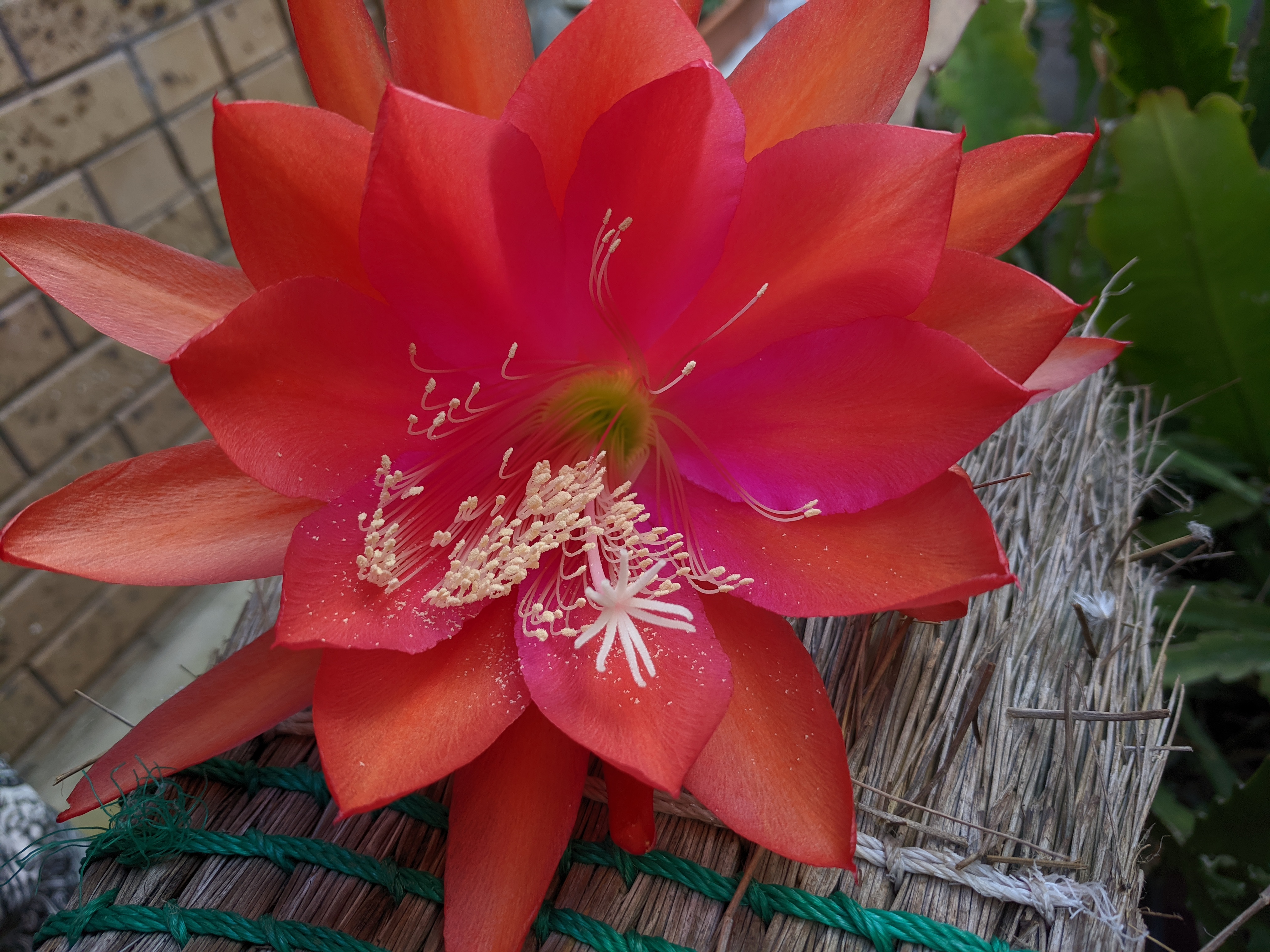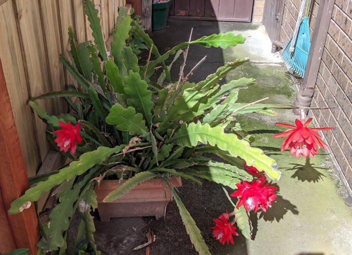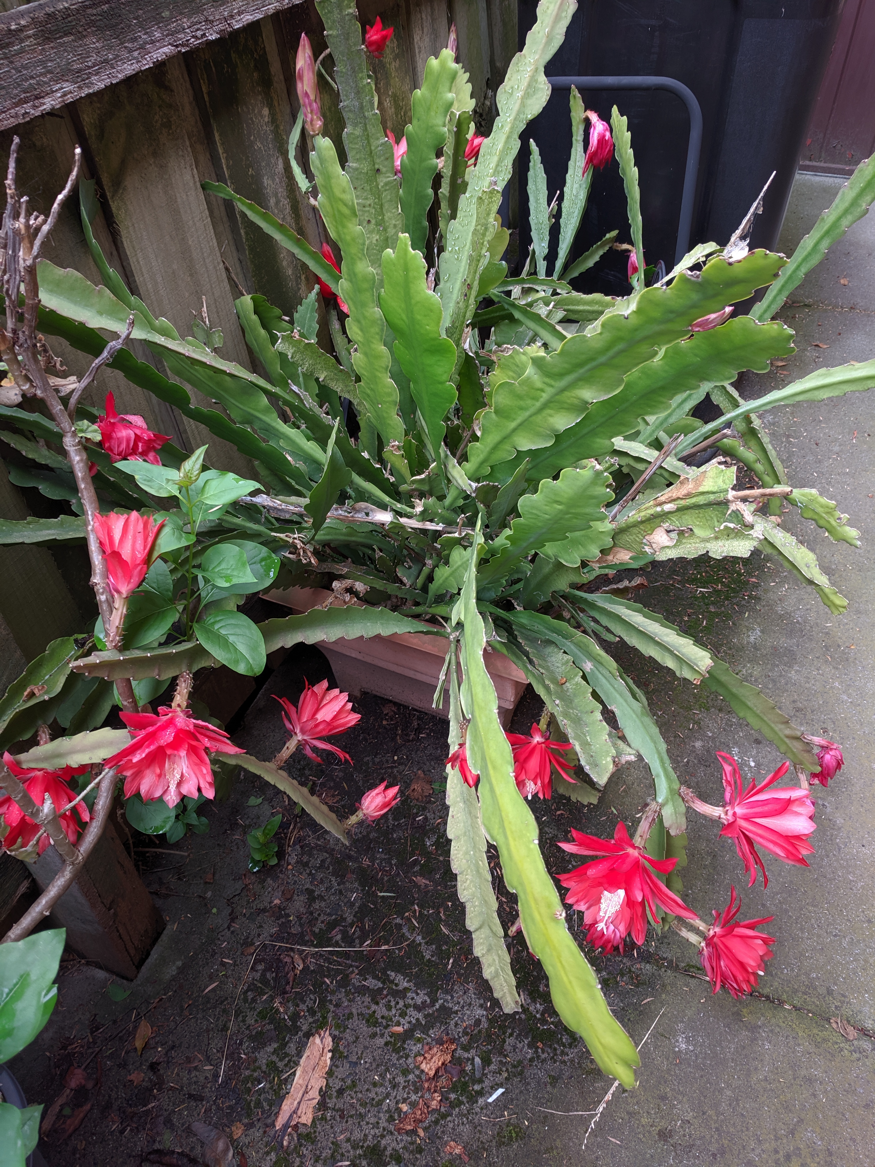 While Disocactus grows best in dry, tropical or subtropical climates, the images above were taken in Melbourne. The pot is in a protected location between the radiant heat of the east facing brick wall of the house and the protection of the adjoining fence. The plants have been growing and flowering very well for years left to their own devices and only sometimes pruned back.