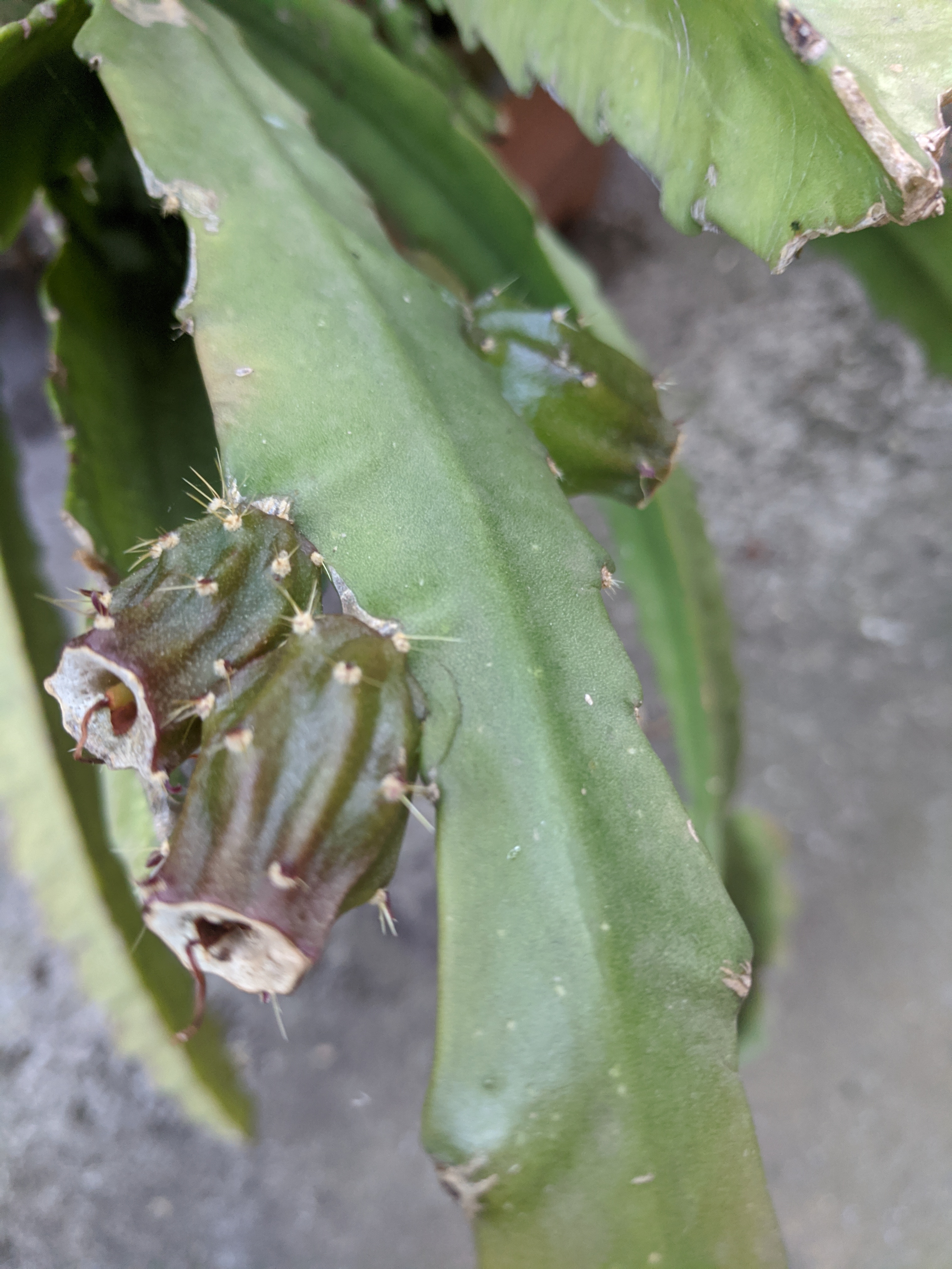 The stems of the plant can be long and flattened. Some have three sided shape. These stems begin as rounded growths then flatten into long, arching notched stems 60 cm to 3m long and up to 7.5cm wide. The image below shows the two types of shape. At the notched margins the plant can produce aerial roots. Secondary stems can grow from the the areolas at the notches as seen in the image below.