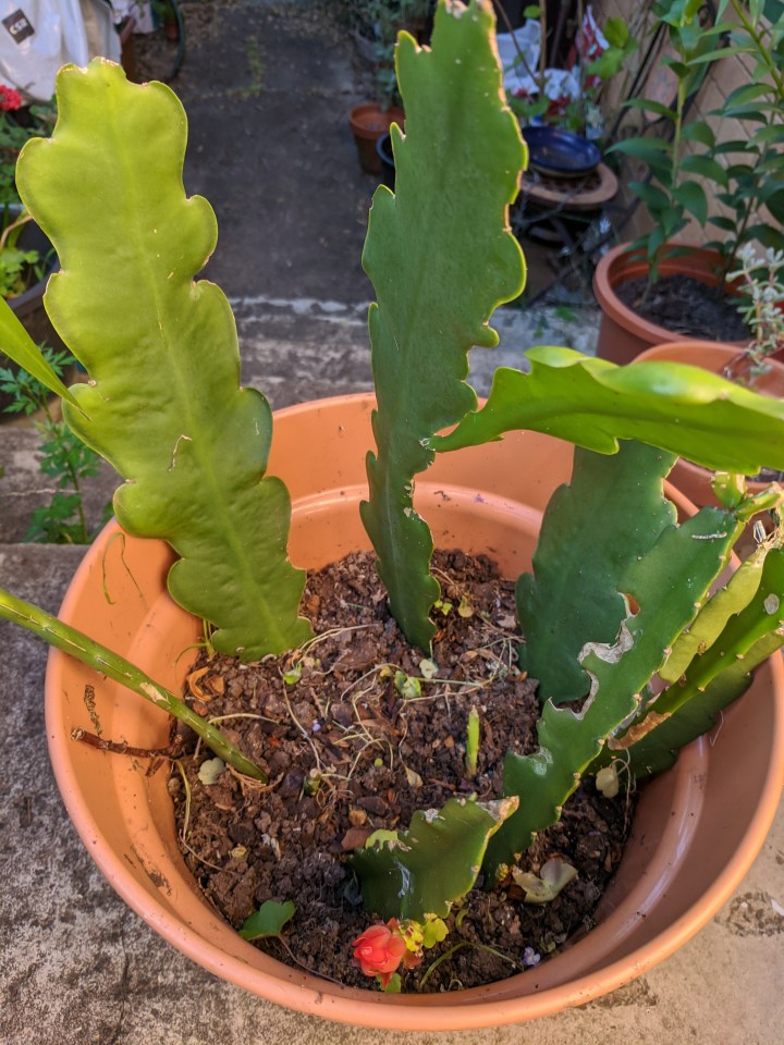 The white Disocactus crenatus is also growing well in the large pot. The word crenatus comes from the word crenations or wavy-tooth to denote the scalloped margin of the stems of the plant.