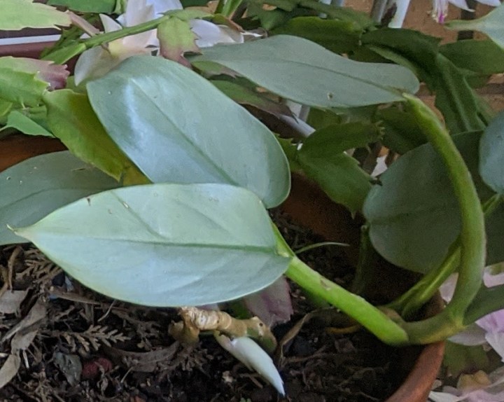 The nodes produce a leaf that comprises a blade and petiole (leaf stalk)and also produces aerial roots. This is also the site of the buds that can later develop as the plant matures. See the image below, where you can see a mature root as well as emergent roots and where the petiole has emerged at the node too.