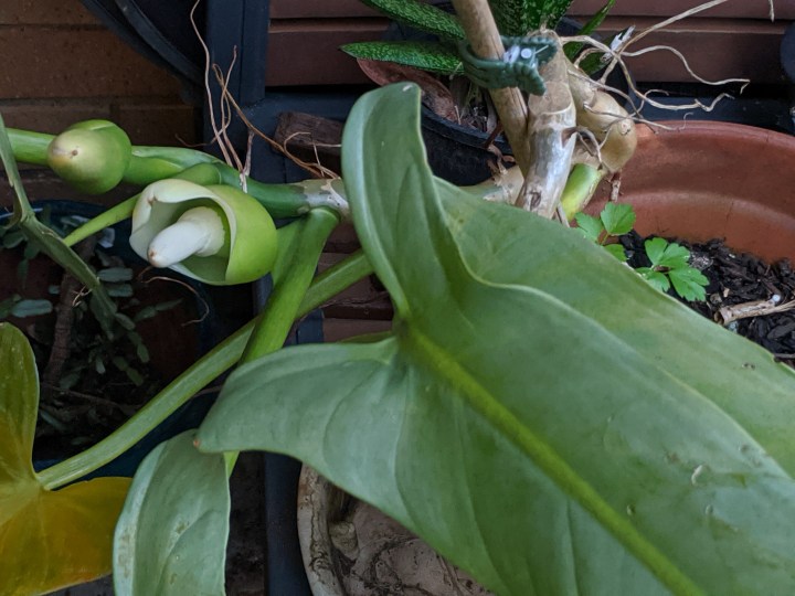 The spathe emerges from the petiole that supports the leaf blade. In this case two spathes emerged in the petioles of the newest leaves adjacent to each other on the stem. They opened one after another.