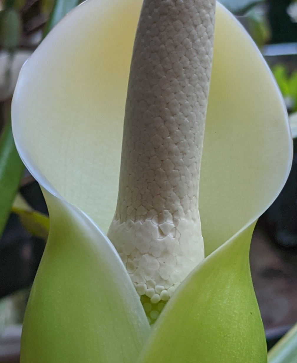 Below is an image of the light green spathe with its creamy interior and the spadix with three distinct zones. From the bottom of the spadix: the lowest zone are the female flowers (just barely seen), then a small ring of infertile male flowers and at the top end the male flowers. Though it is hard to see with the naked eye, each tiny flower is supported on a tiny stalk.