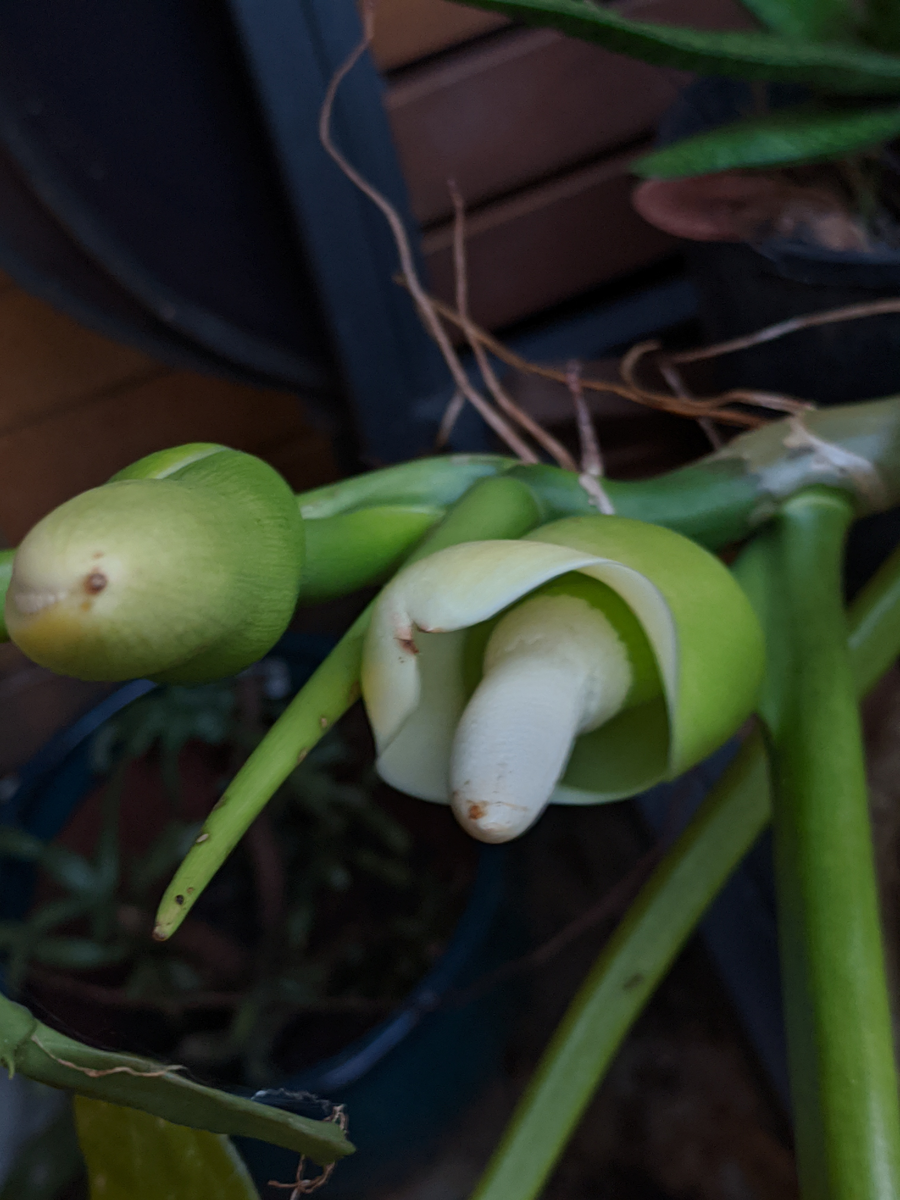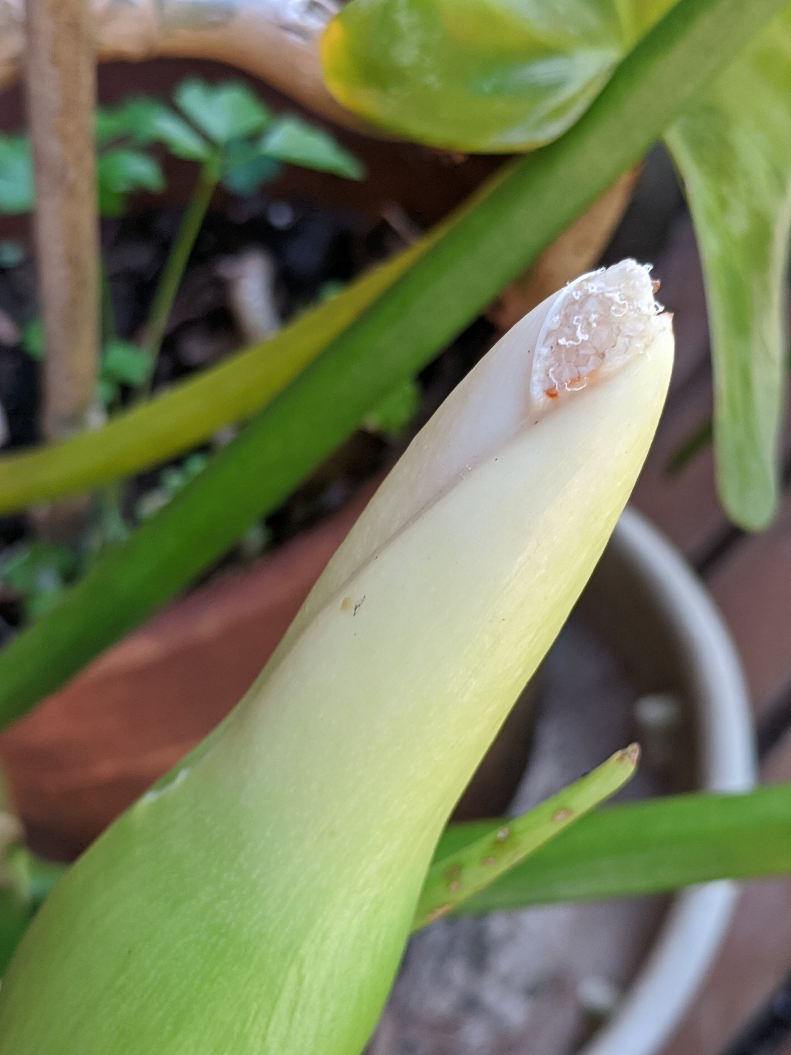The spathe emerges from the petiole that supports the leaf blade. In this case two spathes emerged in the petioles of the newest leaves adjacent to each other on the stem. They opened one after another.