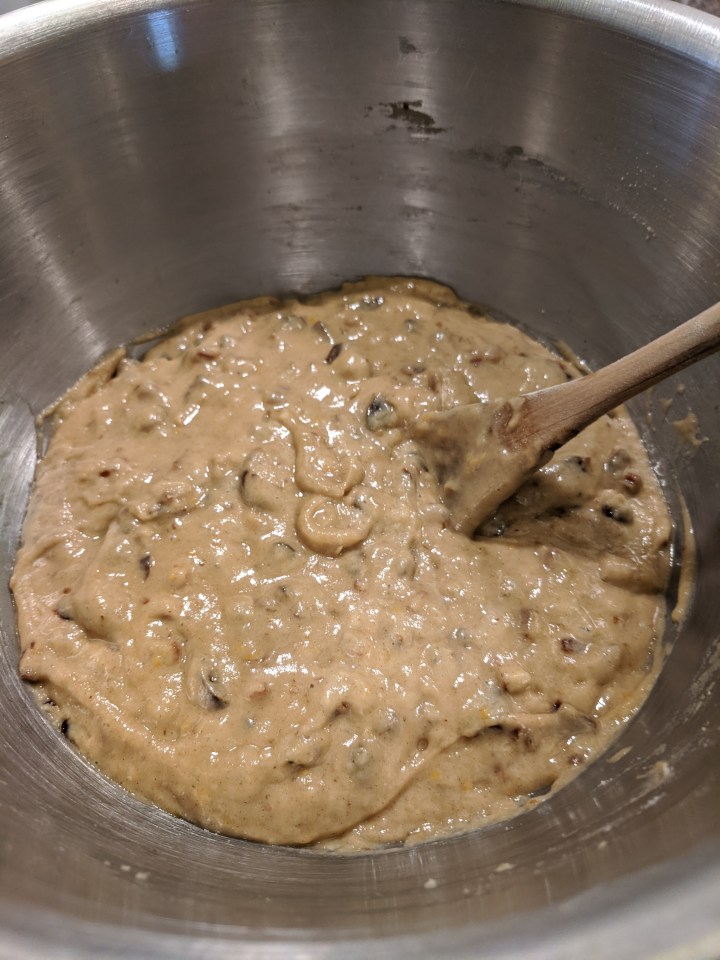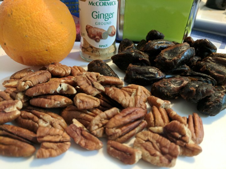 It is a special cake that is made using no butter, milk or eggs. In spite of the simple ingredients, it is really delicious and moist, packed with pecans, raisins and dates. The ginger gives it a spicy lift and the orange, a citrus note to contrast the sweetness of the dates.