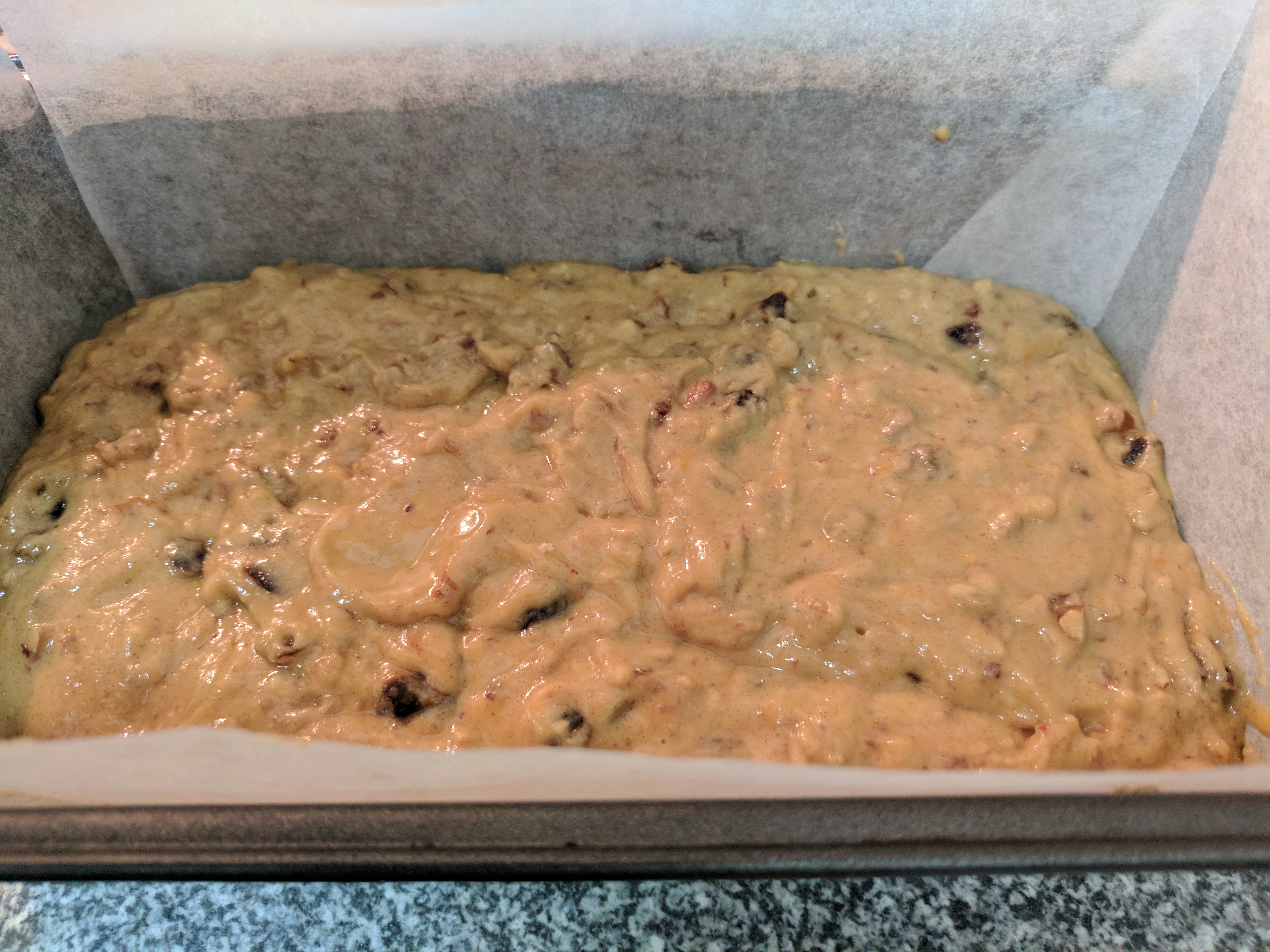 19. Spoon the mixture into the lined loaf pan and tap the pan on the bench to remove any air bubbles