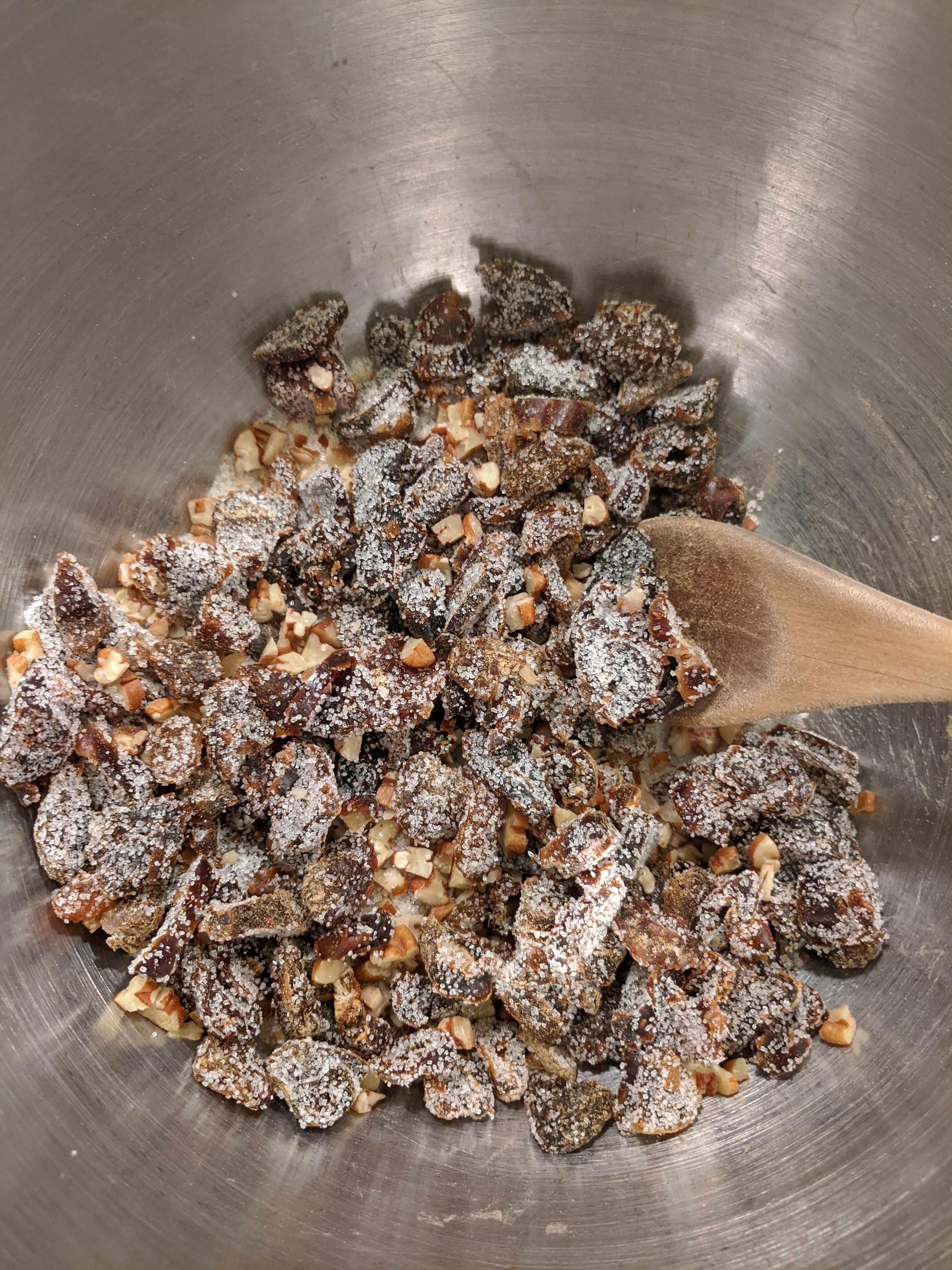 6. Using your fingers, rub the mixture to separate the dates, pecans and raisins to thoroughly separate all the ingredients