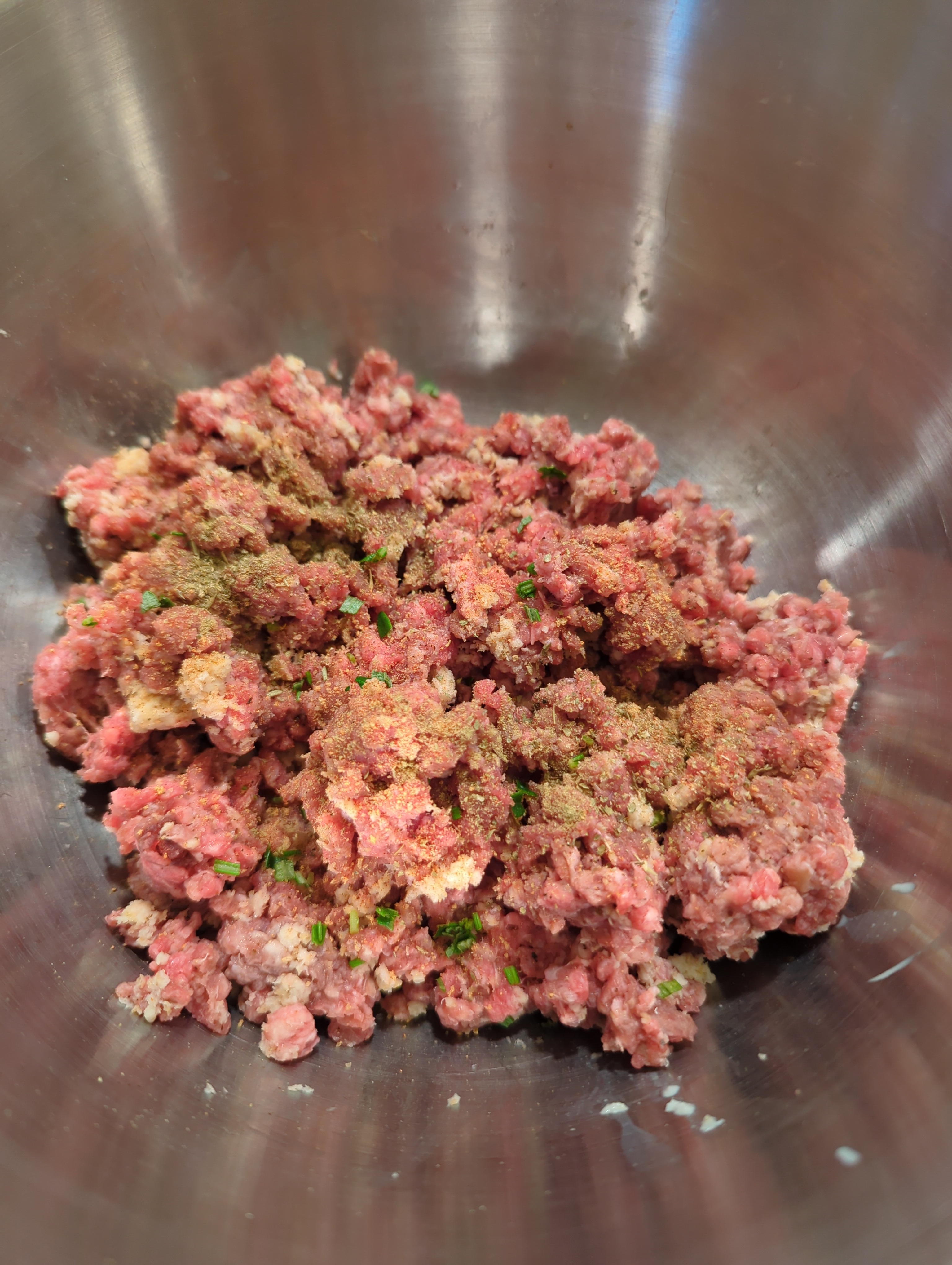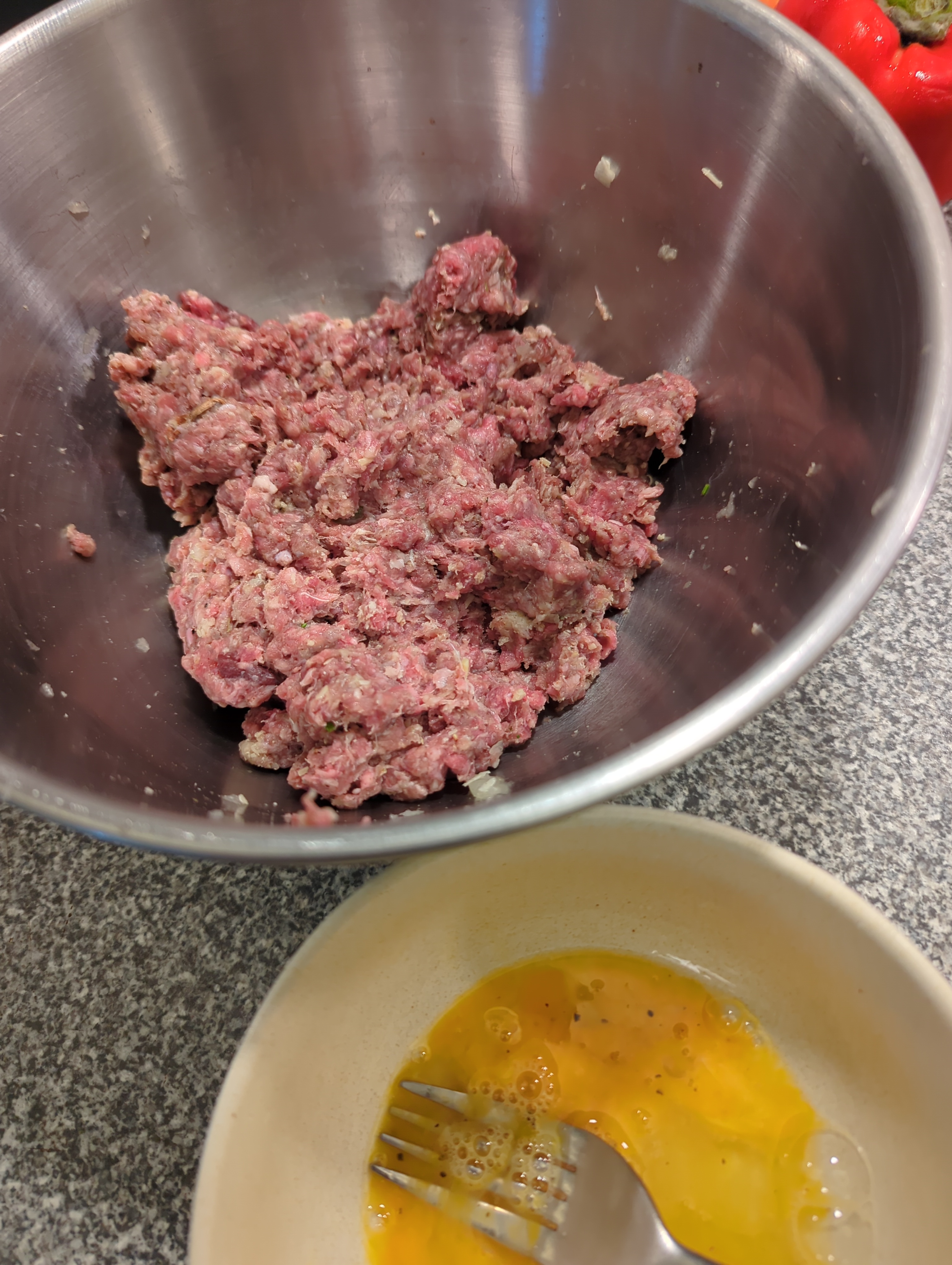 9. Make a well in the meat mixture and add the lightly beaten egg
