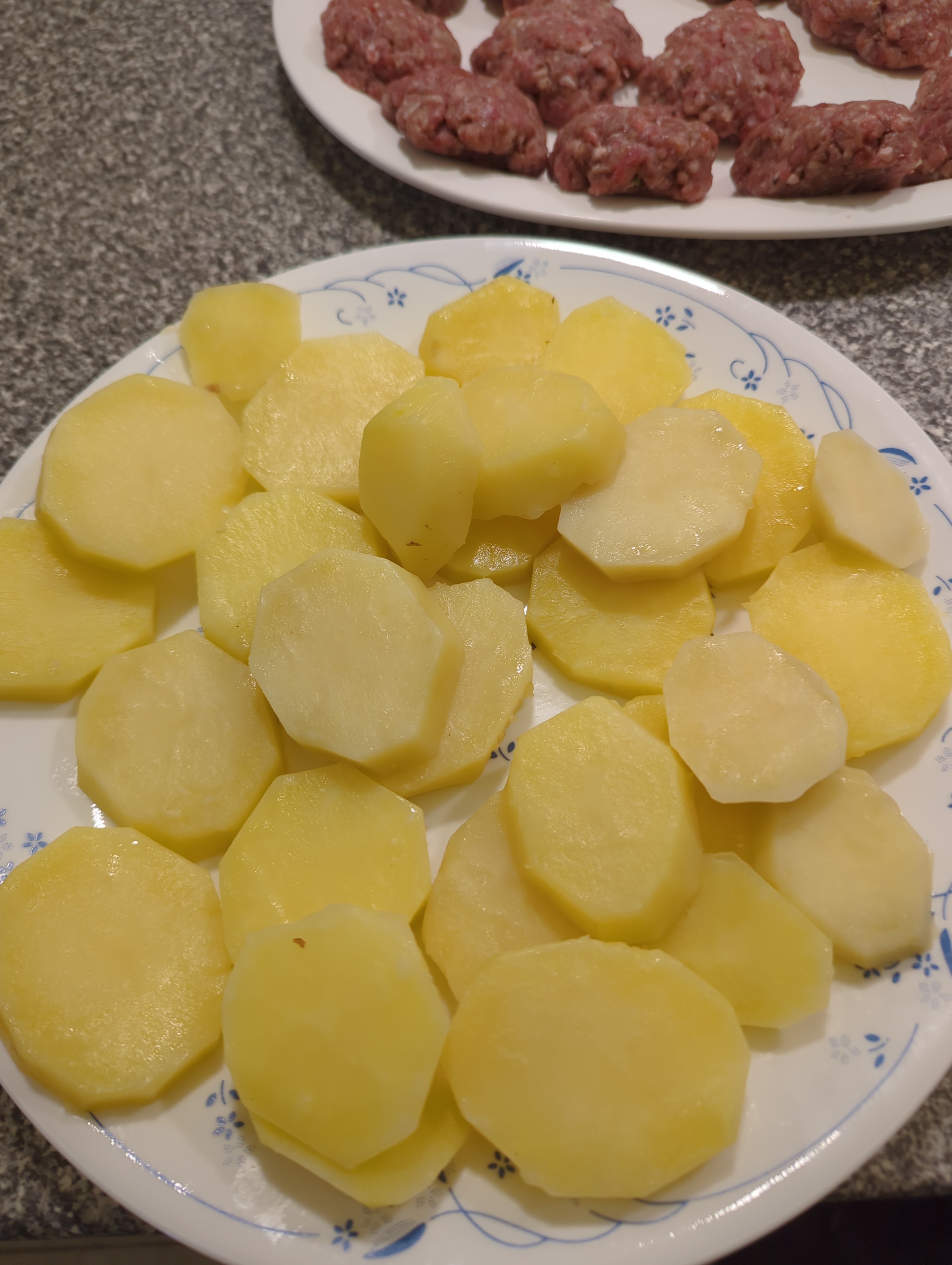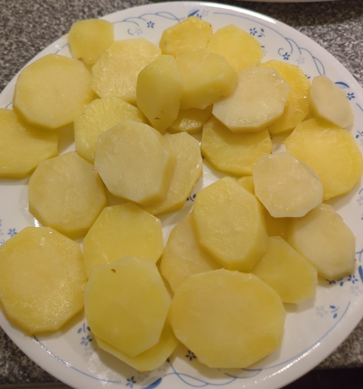 - 4-5 medium potatoes,peeled and sliced across wise into 1cm thick rounds