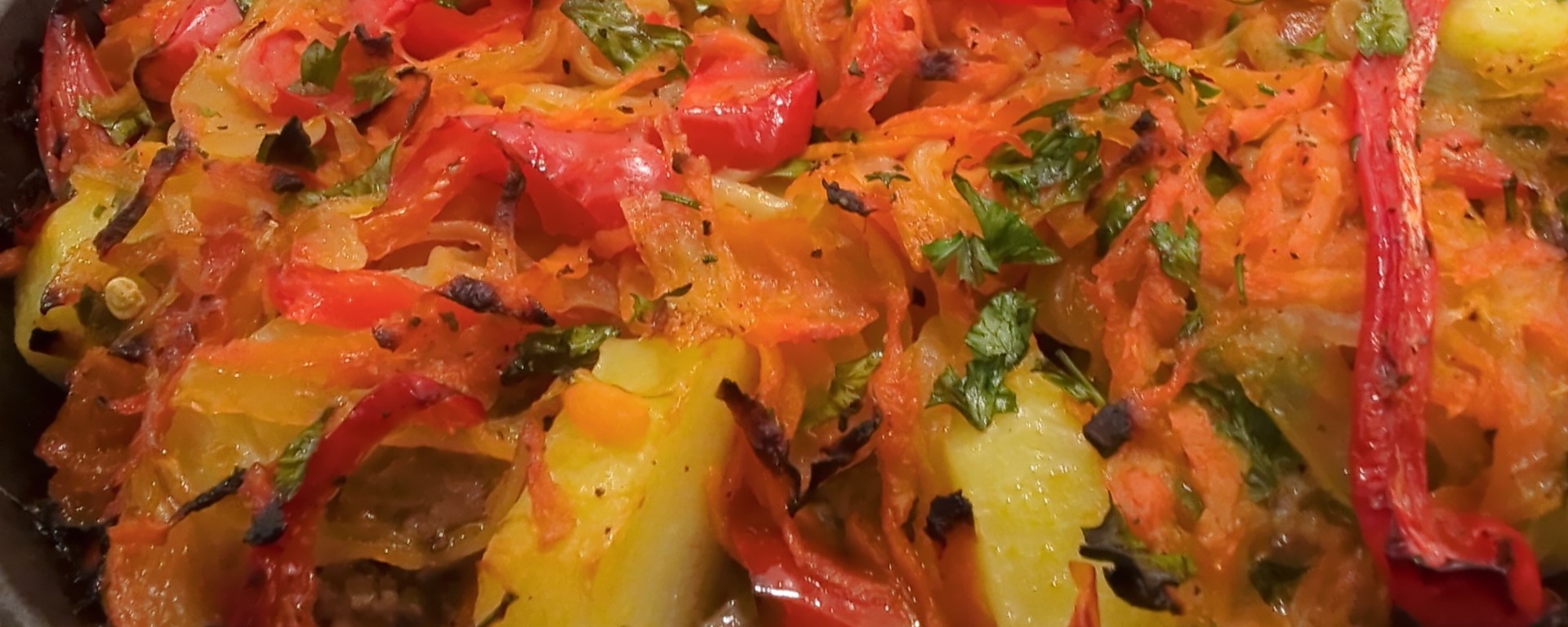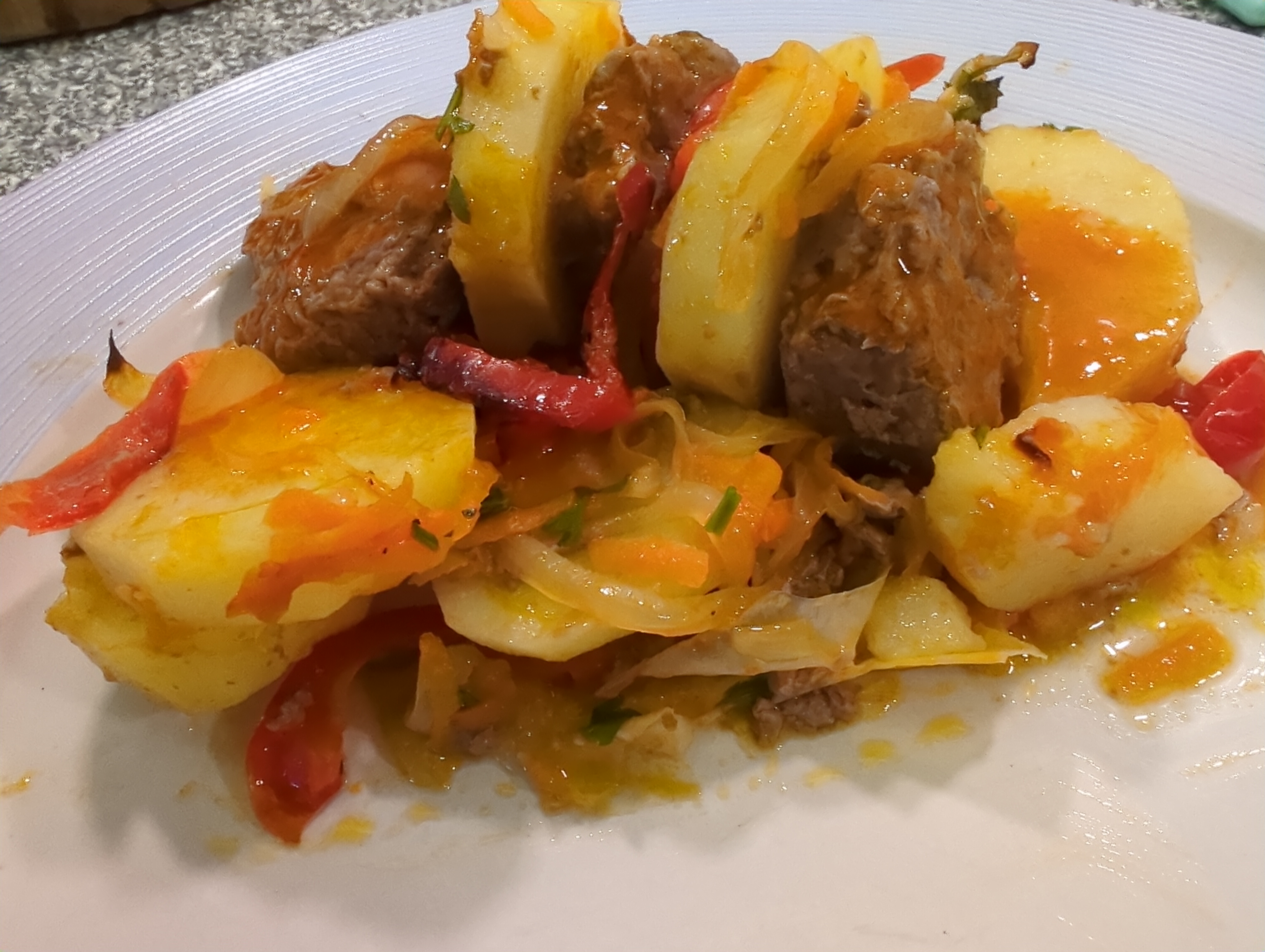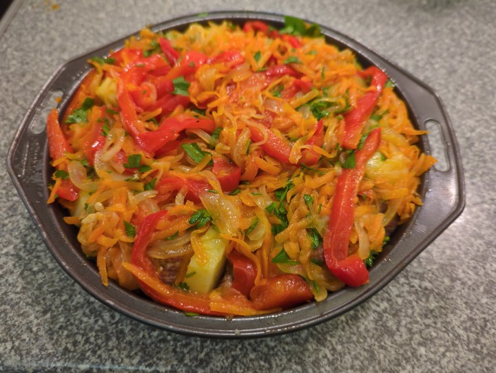 Even with these simple ingredients the meat and vegetables are really delicious when baked. The vegetables caramelise and continue to release their juices over the meat and potatoes. Nothing is wasted as the cooking liquor set aside from preparing the vegetables makes a lovely tasty jus to spoon over everything when serving.